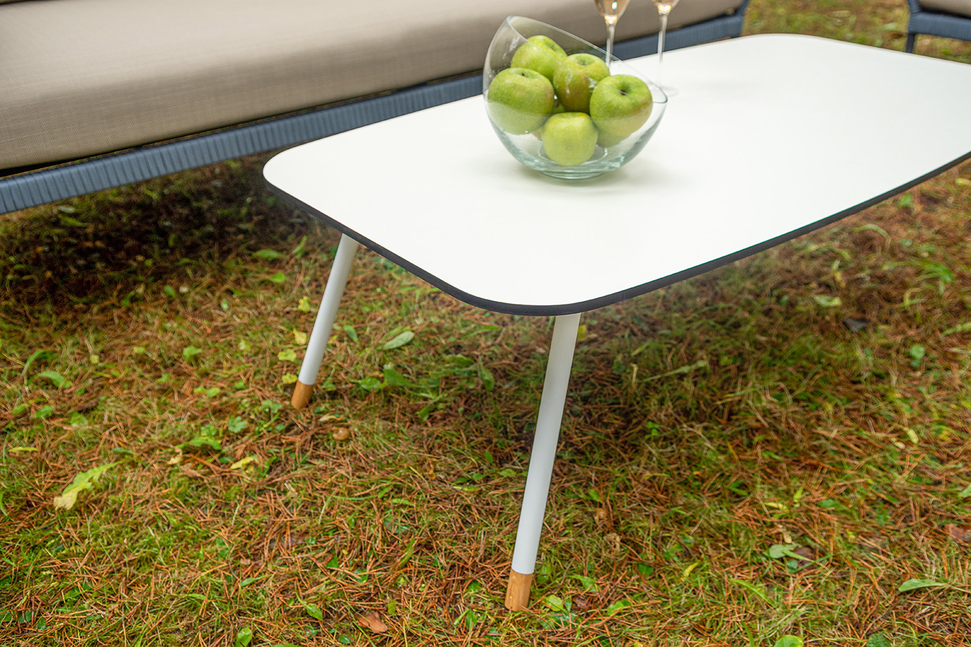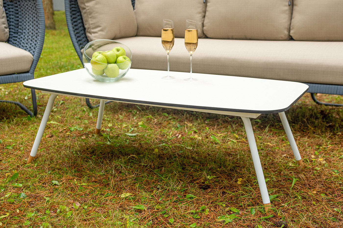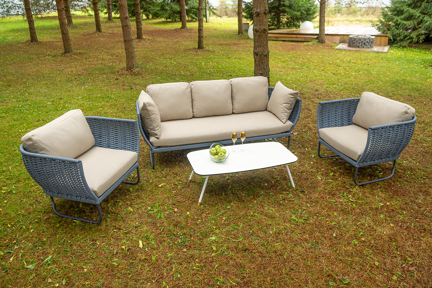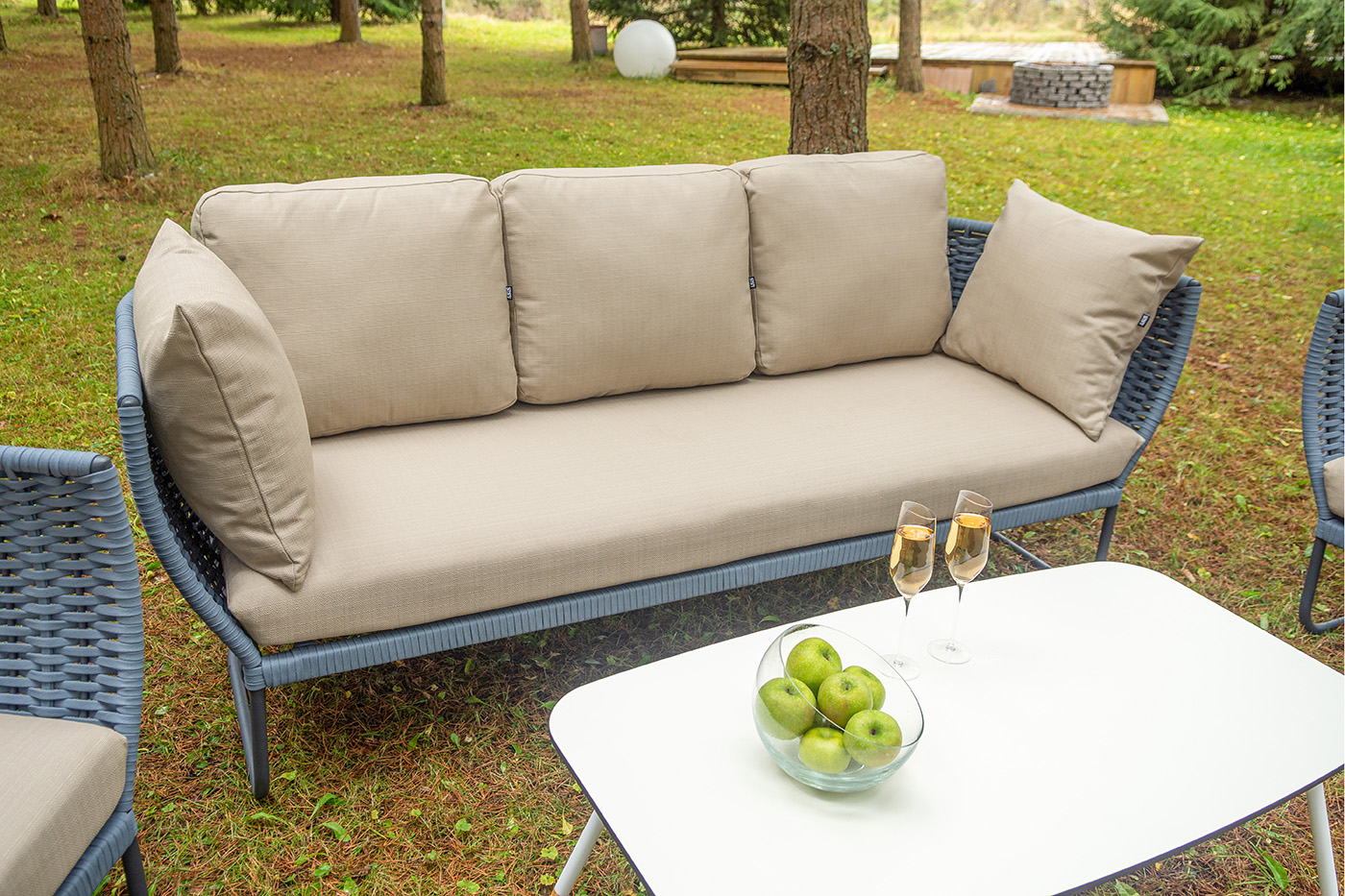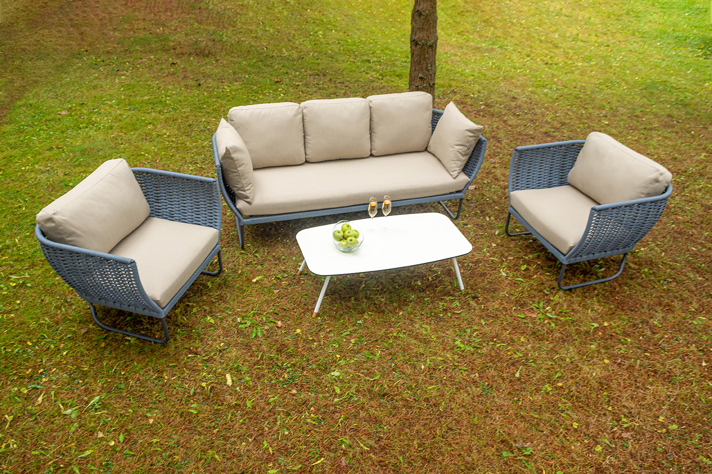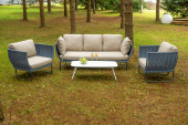 "Фиджи" диван 3-местный плетеный из роупа, каркас алюминий темно-серый (RAL7024) муар, роуп синий (KT18-0014) 15 мм tex, ткань Mossle бежевая 11шт. 2 140Х900Х790, "Фиджи" кресло плетеное из роупа, каркас алюминий темно-серый (RAL7024) муар, роуп синий (KT18-0014) 15 мм tex, ткань Mossle бежевая 2шт. 1 070Х920Х610, "Диего" журнальный стол из HPL 120х60 H40, каркас белый муар, цвет "молочный" 1шт. 1 200Х600Х400,