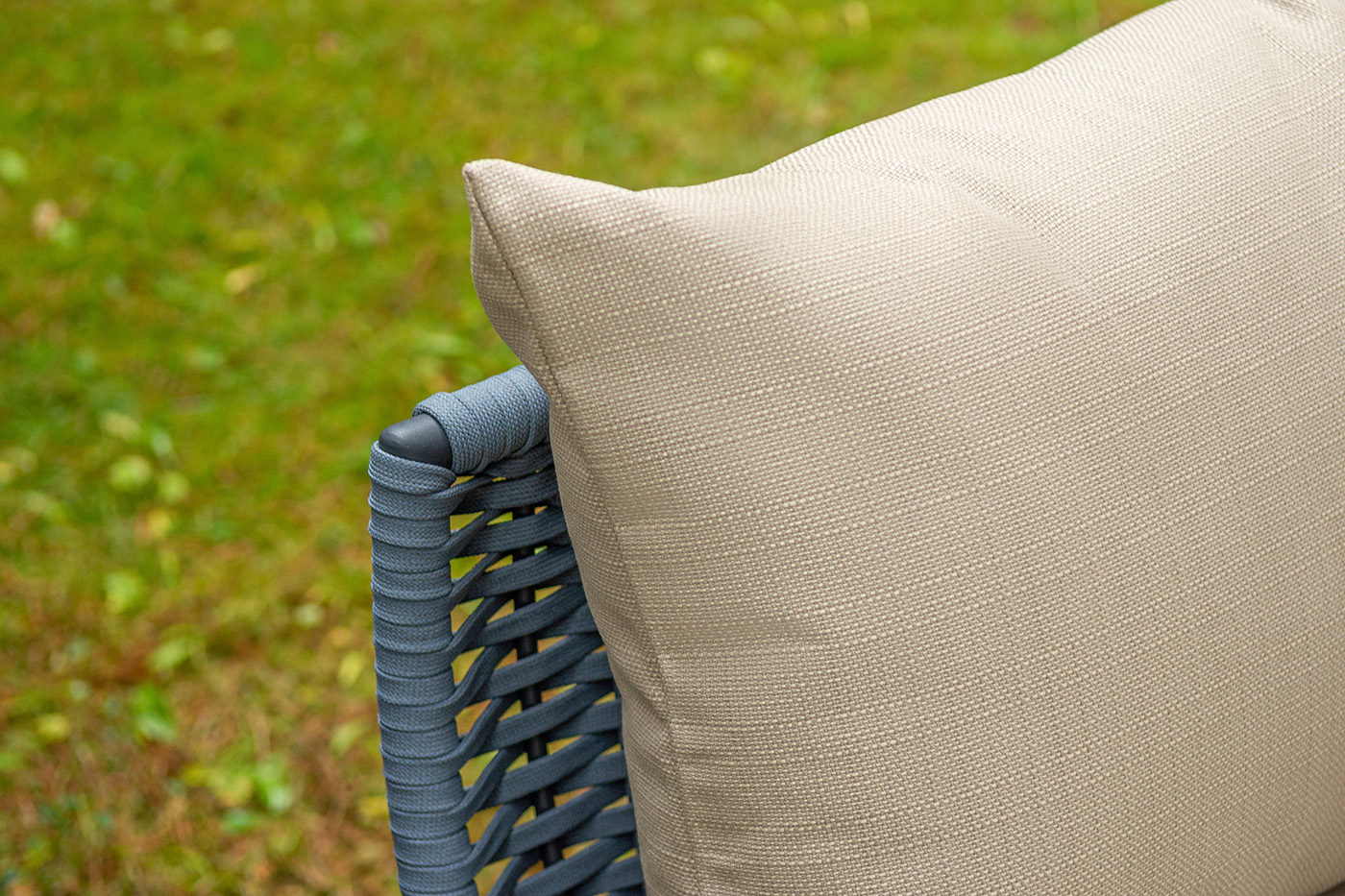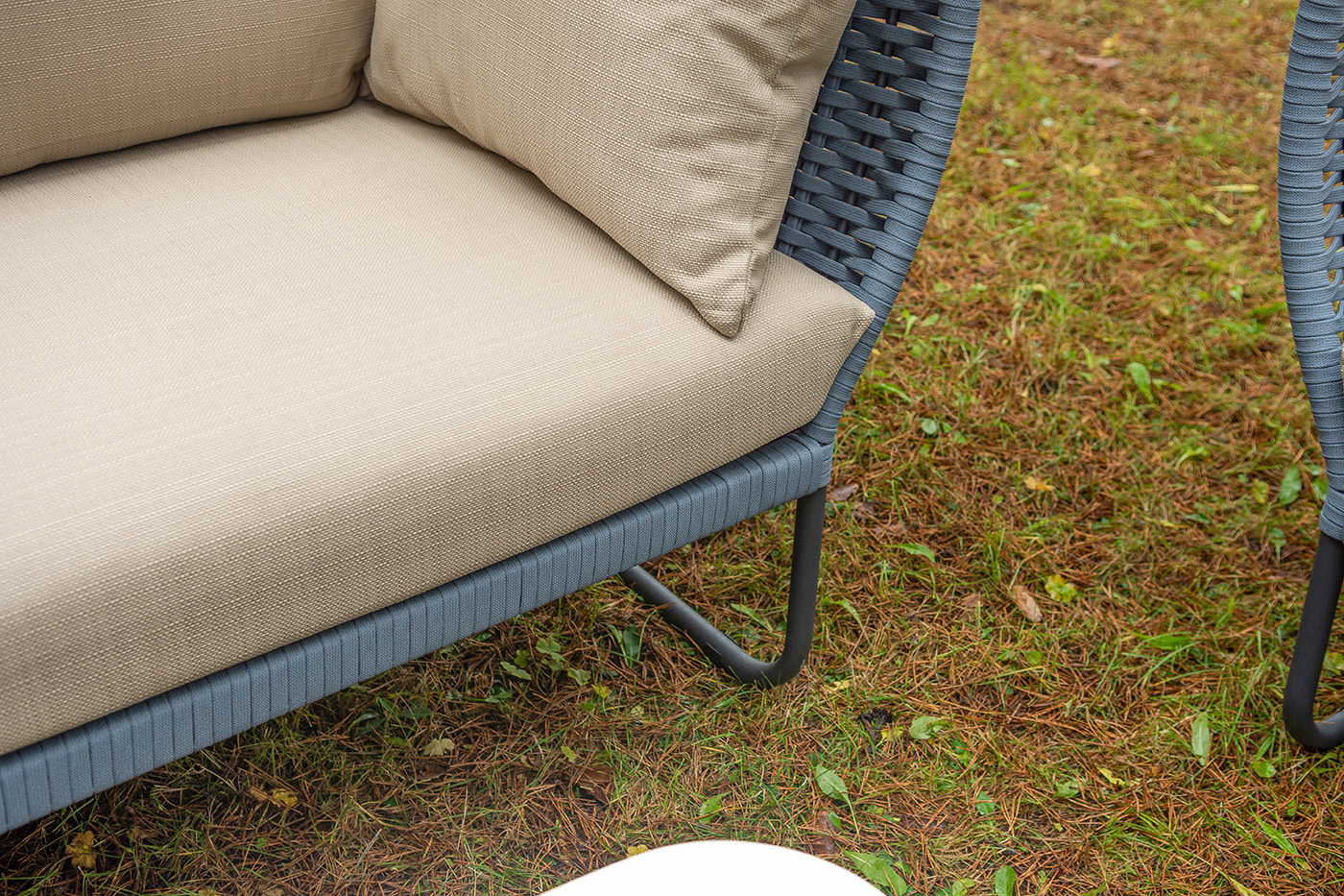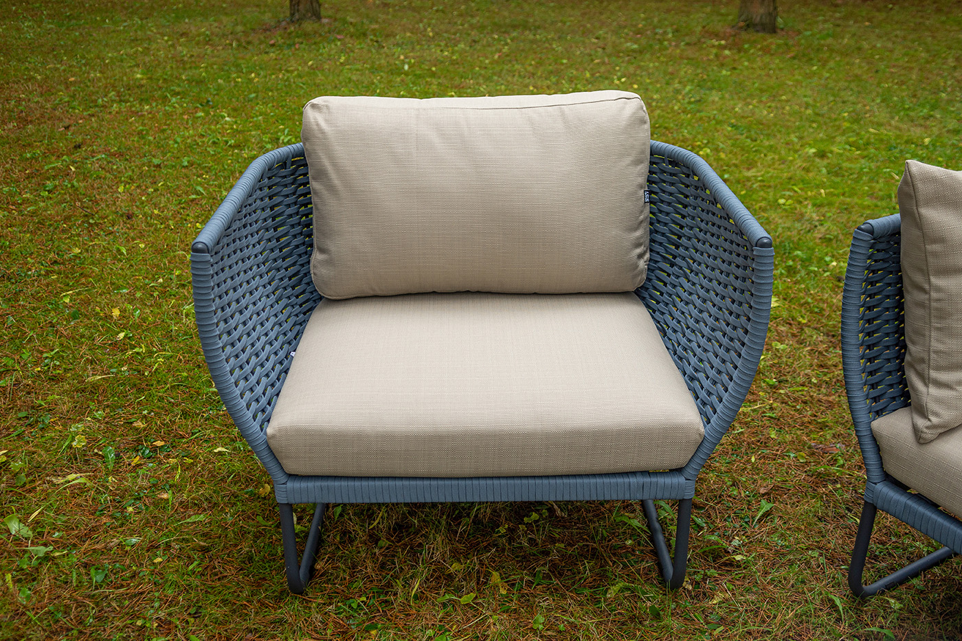 Боковины дивана и кресел вручную оплетены синими синтетическими лентами из высокопрочных полиэфирных волокон. Плетение придает мебели выразительный облик и удачно дополняет цвет каркаса.