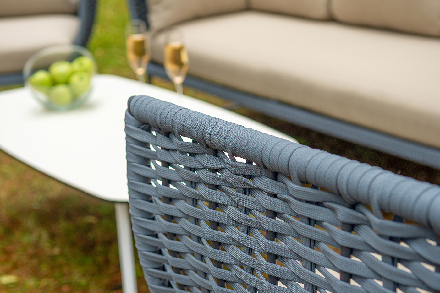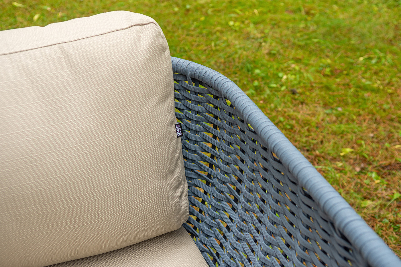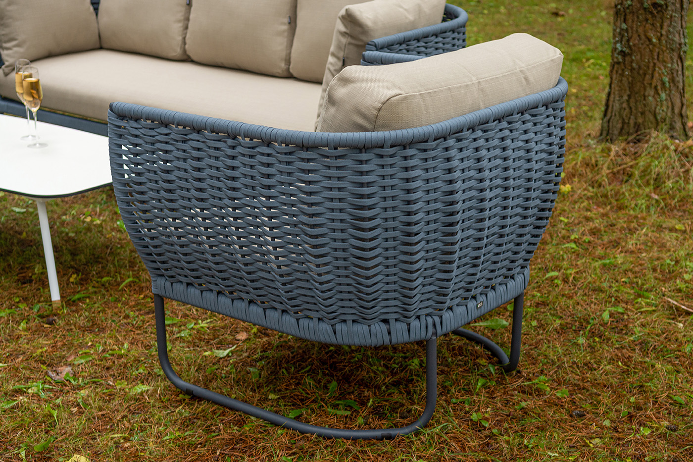 Боковины дивана и кресел вручную оплетены синими синтетическими лентами из высокопрочных полиэфирных волокон. Плетение придает мебели выразительный облик и удачно дополняет цвет каркаса.