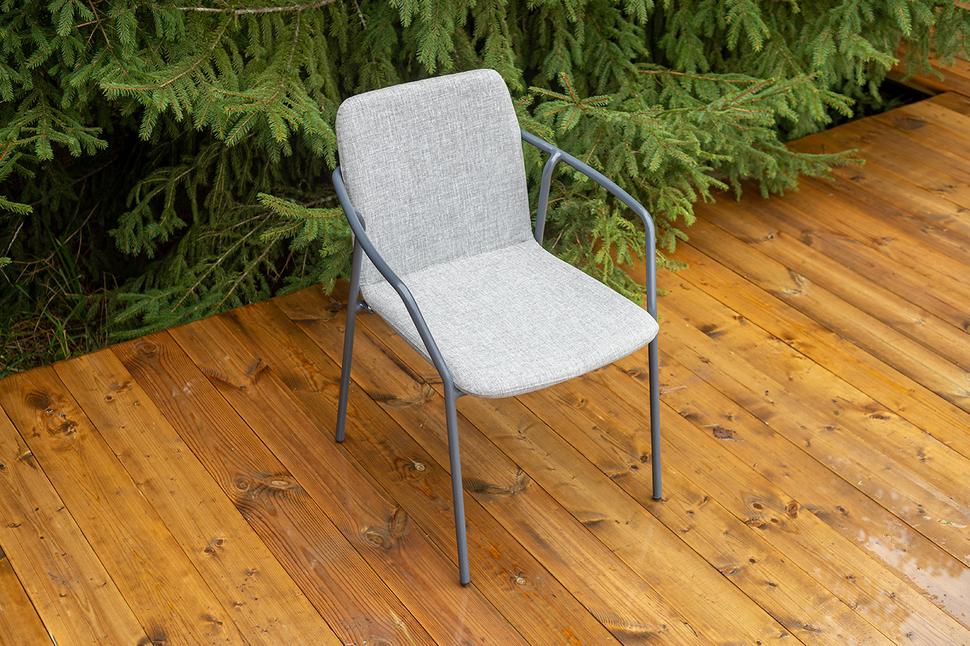 В комплект входят два стула «Марокко» (575×600×800 мм) из текстилена Nanotex с алюминиевым каркасом в темно‑сером цвете (RAL7024) и круглый журнальный столик «Колумбия» (400×400×550 мм) с алюминиевым каркасом и столешницей из монолитного компакт‑пластика HPL (12 мм) в оттенке «серый гранит».