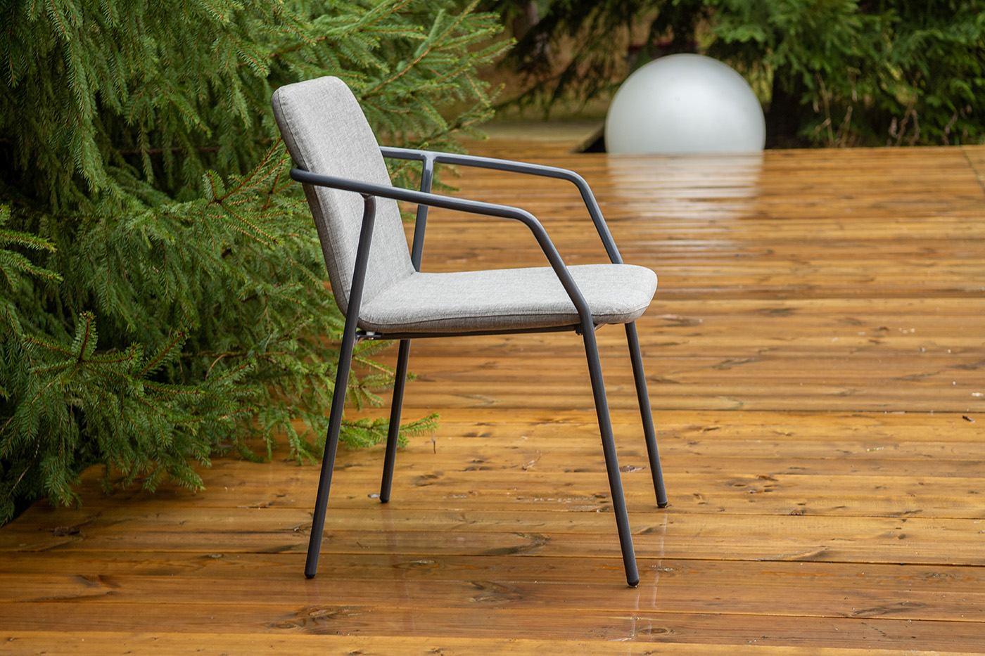 Мебель отличается прочностью, легкостью, устойчивостью к влаге и ультрафиолету, проста в уходе и гармонично впишется в интерьер домашней библиотеки, зимнего сада, веранды или балкона. "Марокко" стул из текстилена nanotex, каркас алюминий темно-серый (RAL7024), цвет серый 2шт. 575Х600Х800, "Колумбия" журнальный стол из HPL круглый Ø40 H55, каркас из алюминия темно-серый (RAL 7024), цвет столешницы "серый гранит" 1шт. 400Х400Х550,