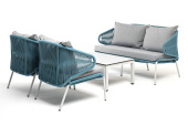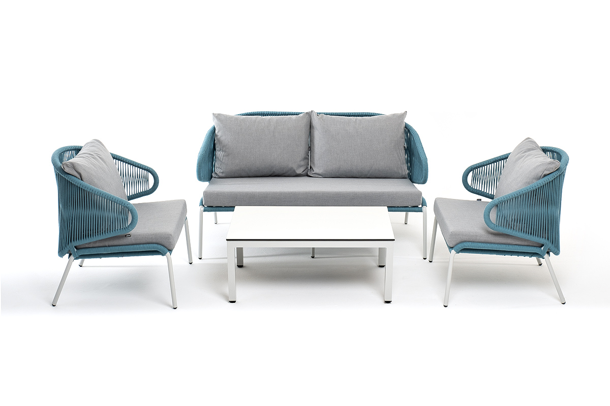 "Канны" журнальный столик из HPL 90х60, H40, каркас белый, цвет столешницы "молочный" 1шт. 900Х600Х400, "Милан" диван 2-местный плетеный из роупа, каркас алюминий светло-серый (RAL7035) муар, роуп бирюзовый круглый, ткань светло-серая 1шт. 1 450Х650Х830, "Милан" кресло плетеное из роупа, каркас алюминий светло-серый (RAL7035) муар, роуп бирюзовый круглый, ткань светло-серая 2шт. 700Х650Х830,
