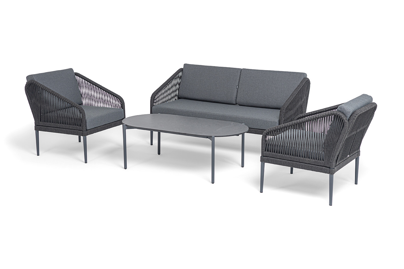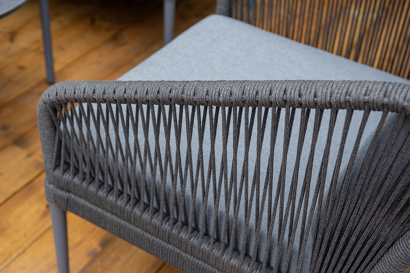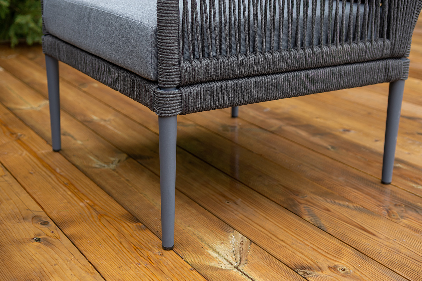 Каркас мебели изготовлен из алюминия, а боковины кресел и дивана оплетены темно‑серыми синтетическими лентами из высокопрочных полиэфирных волокон.