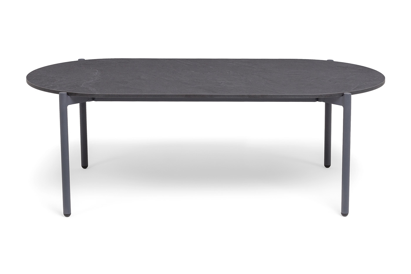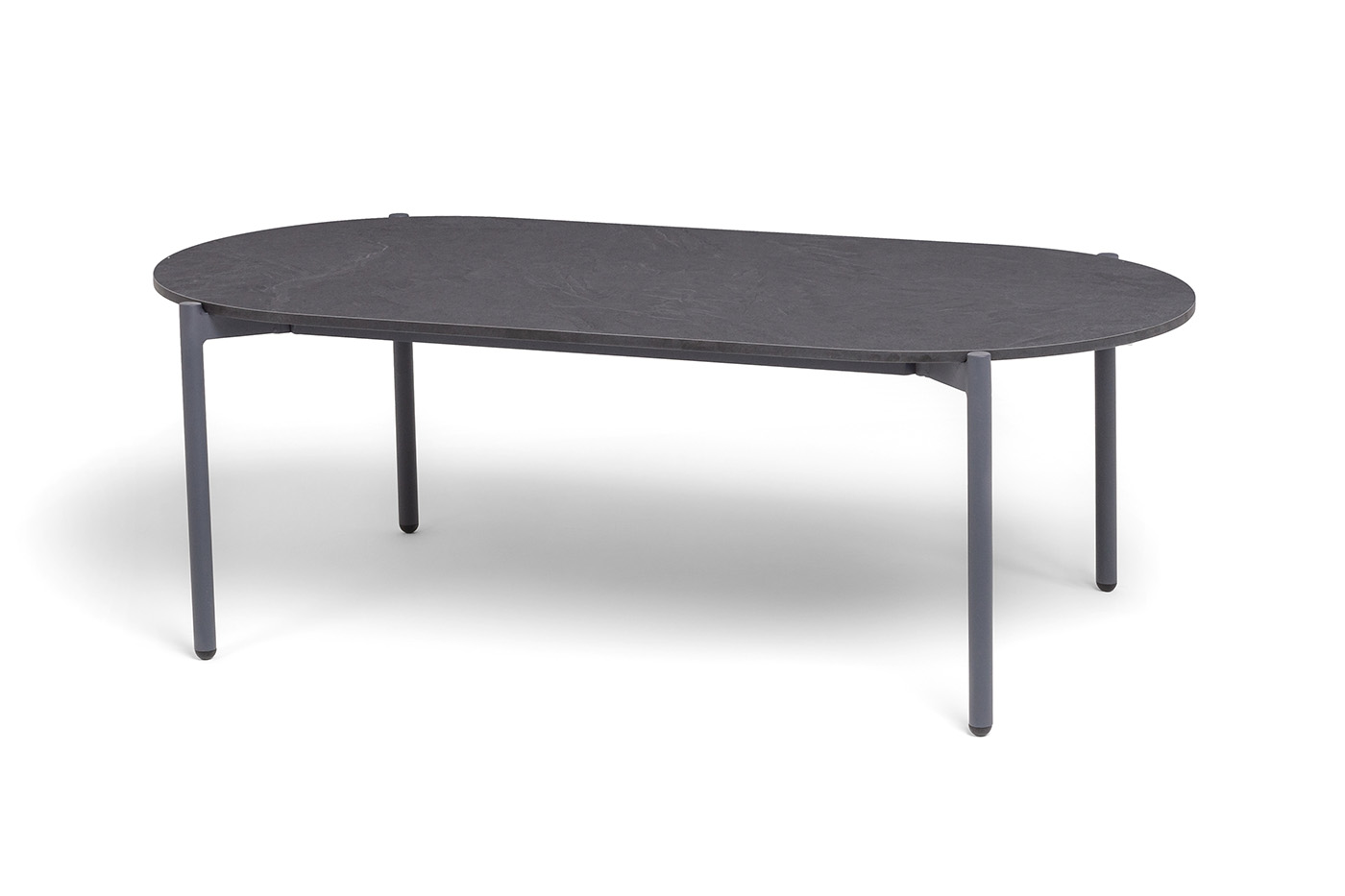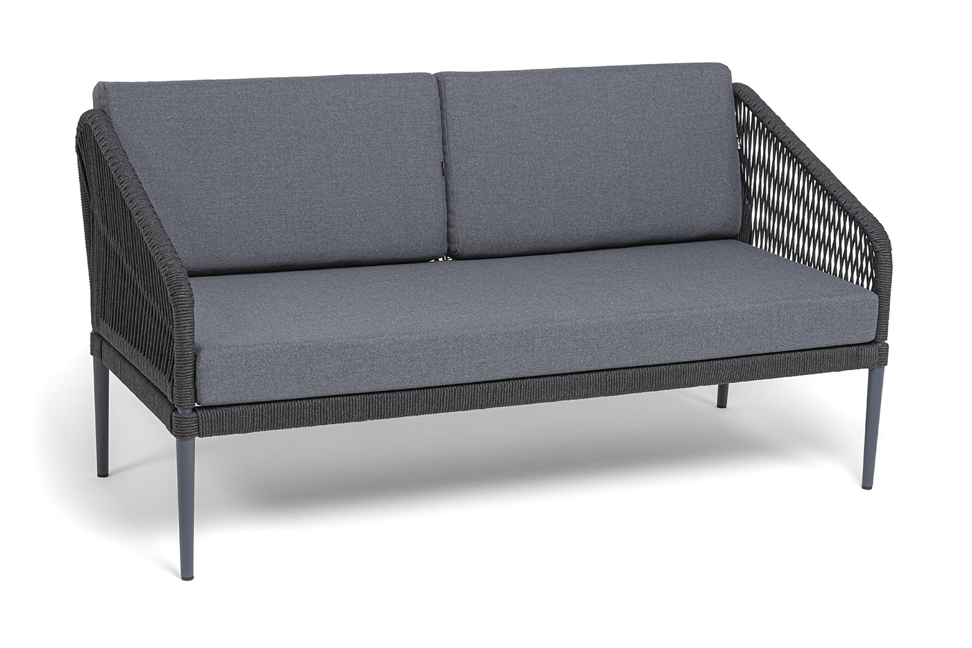 Каркас мебели изготовлен из алюминия, а боковины кресел и дивана оплетены темно‑серыми синтетическими лентами из высокопрочных полиэфирных волокон.