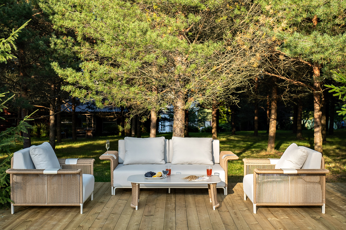 Комплект выполнен из алюминиевого каркаса, окрашенного порошковой износостойкой краской. Оттенок - «слоновая кость». Искусственный ротанг соломенного цвета украшает мебель в качестве круглого ручного плетения - 7 мм.