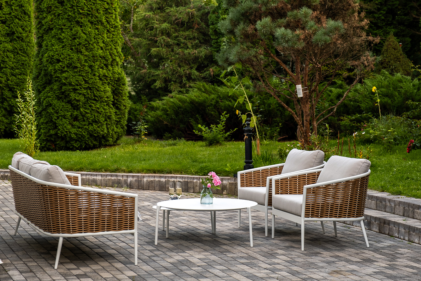 Плетена "Тоскана" диван из искусственного ротанга трехместный, цвет соломенный 1шт. 2 260Х815Х750, "Тоскана" кресло из искусственного ротанга, цвет соломенный 2шт. 815Х870Х750, "Тоскана" журнальный столик круглый Ø103, H28,5, цвет белый 1шт. 1 030Х1 030Х285, "Тоскана" журнальный столик круглый Ø65, H38,5, цвет белый 1шт. 650Х650Х385,