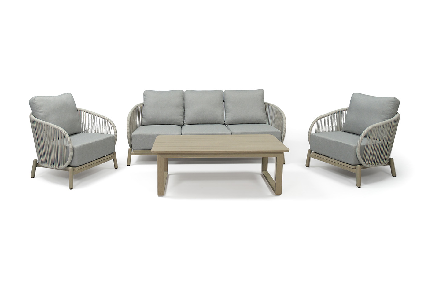Журнальный столик выполнен из прочного алюминия в стильном цвете "Прато" кресло плетеное из роупа, цвет светло-серый, каркас под дерево (холодно-бежевый) 2шт. 805Х805Х700, "Прато" журнальный столик из алюминия 1шт. 1 400Х650Х400, "Прато" диван 3-местный плетеный из роупа, цвет светло-серый, каркас под дерево (холодно-бежевый) 1шт. 1 915Х805Х700,