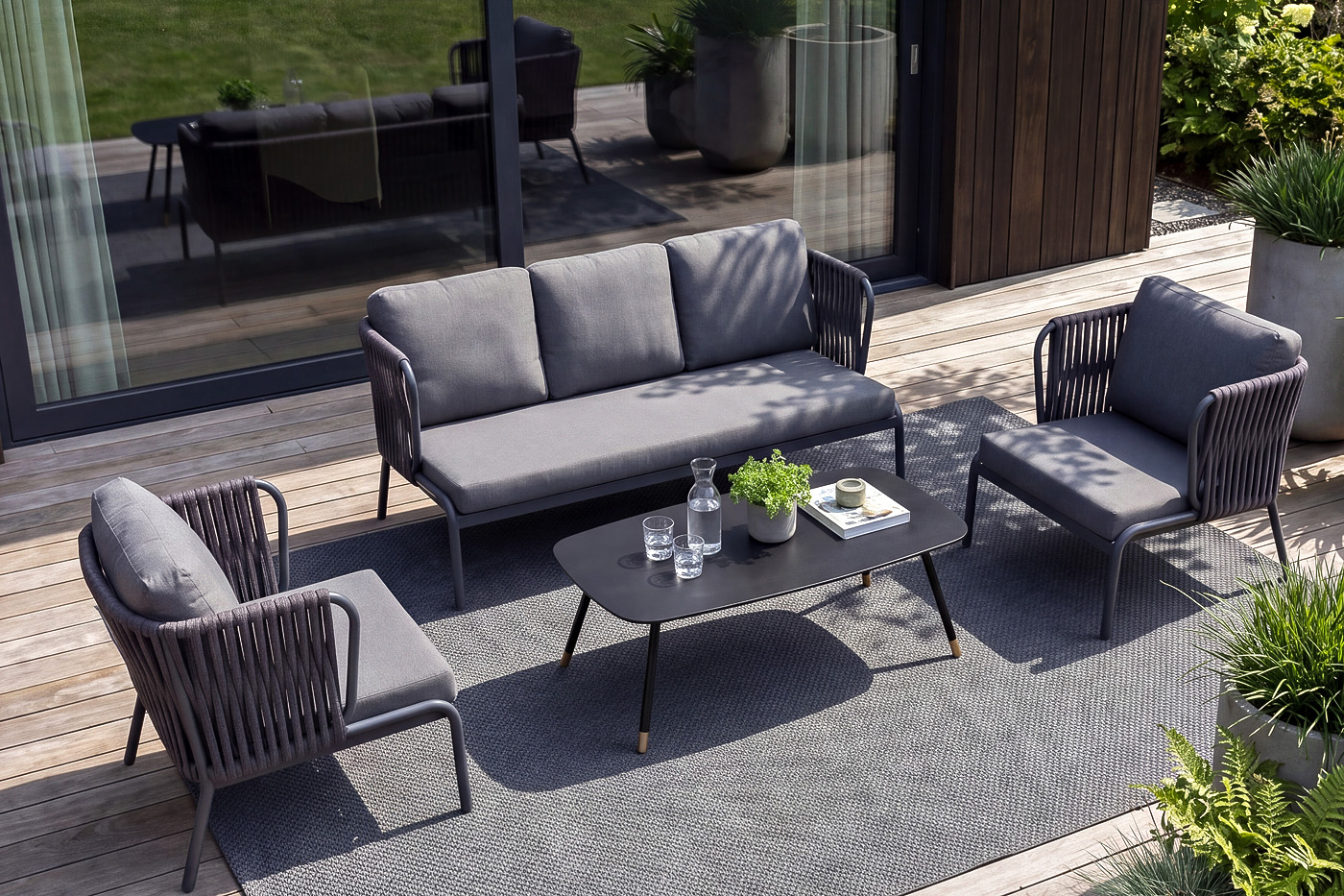 Плетение: боковины и спинка вручную оплетены роупом — эластичными синтетическими лентами (40 мм) из высокопрочных полиэ "Ронда" диван 3-местный плетеный из роупа, каркас алюминий темно-серый (RAL7024) муар, роуп серый 40 мм tex, ткань темно-серая 027 1шт. 1 895Х910Х730, "Ронда" кресло плетеное из роупа, каркас алюминий темно-серый (RAL7024) муар, роуп серый 40 мм tex, ткань темно-серая 027 2шт. 940Х910Х730, "Верона" журнальный стол из HPL 120х65, H40, каркас черный муар, цвет столешницы "серый гранит" 1шт. 1 200Х650Х400,