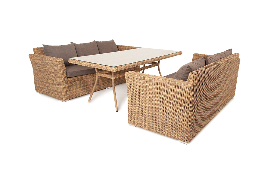 Каркас изделий выполнен из легкого и прочного алюминия, благодаря чему мебель можно легко двигать. Для удобства сидения на диванах предусмотрены подушки со съёмными чехлами серого "Капучино" диван из искусственного ротанга трехместный, цвет соломенный 2шт. 2 220Х865Х815, "Латте" плетеный стол из искусственного ротанга 200х90см, цвет соломенный 1шт. 2 000Х900Х750,
