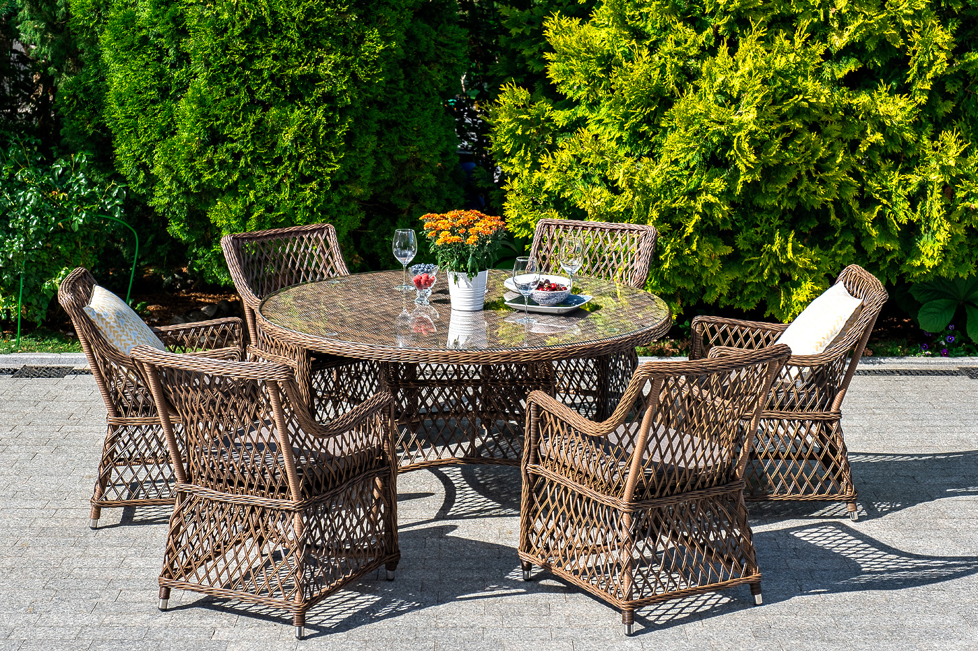 Вся мебель изготовлена из долговечного и легкого алюминия, обтянутого синтетическим ротангом. На столе для удобства эксплуатации предусмотрена столешница из ударопрочного закаленного стекла 5 мм. Стулья укомплектованы подушками на сидениях.