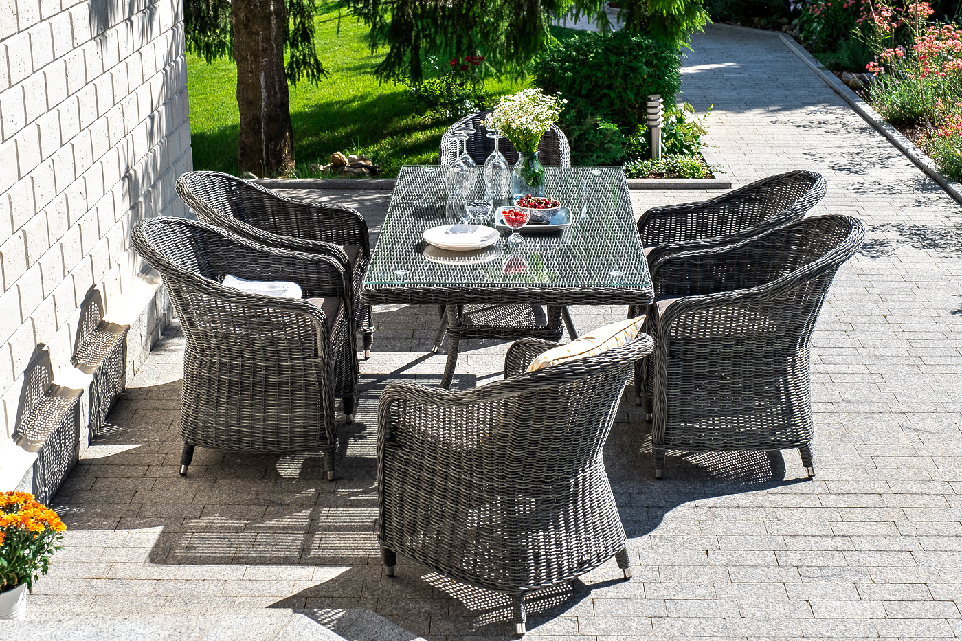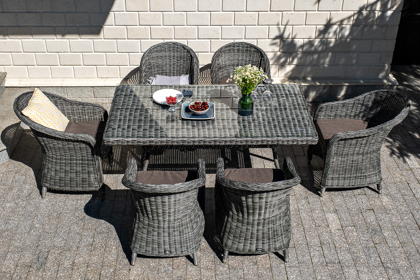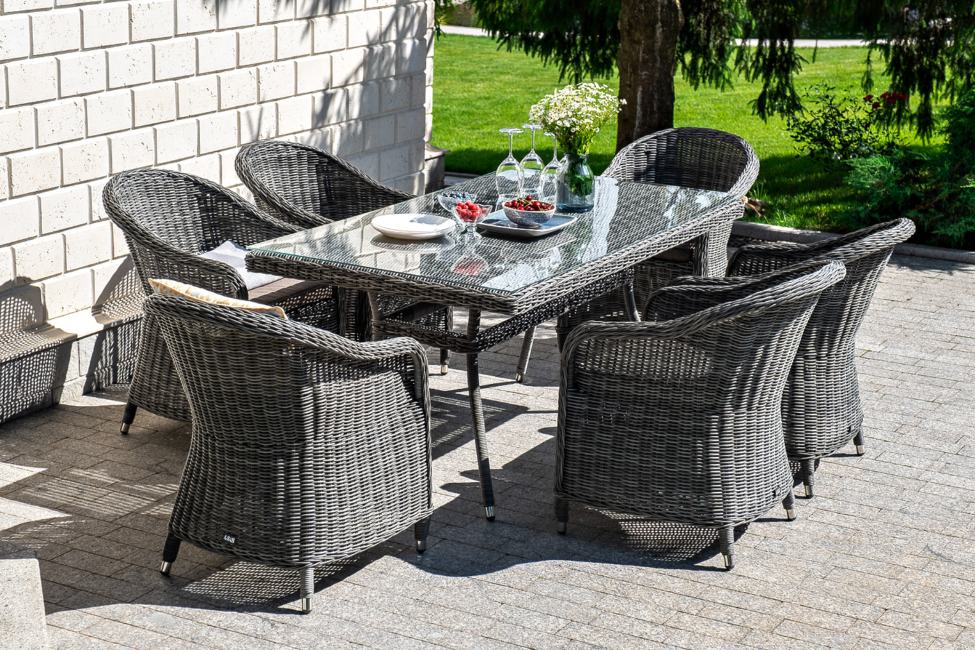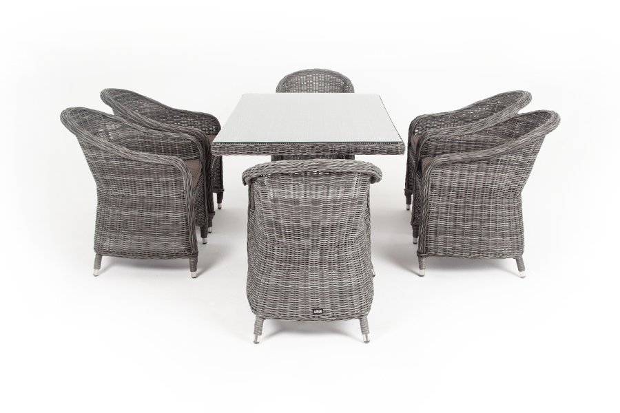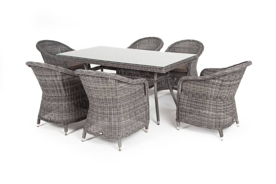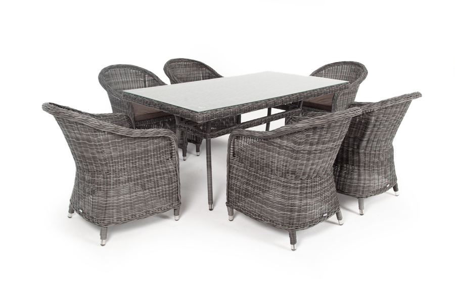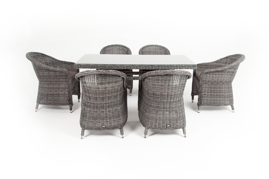 Стеклянная столешница, толщиной 5 мм, идет в комплекте со столом. Подушки на плетеных стулья со съёмными чехлами и водоотталкивающей пропиткой. "Латте" плетеный стол из искусственного ротанга 160х90см, цвет графит 1шт. 1 600Х900Х750, "Равенна" плетеное кресло из искусственного ротанга, цвет графит 6шт. 570Х680Х810,