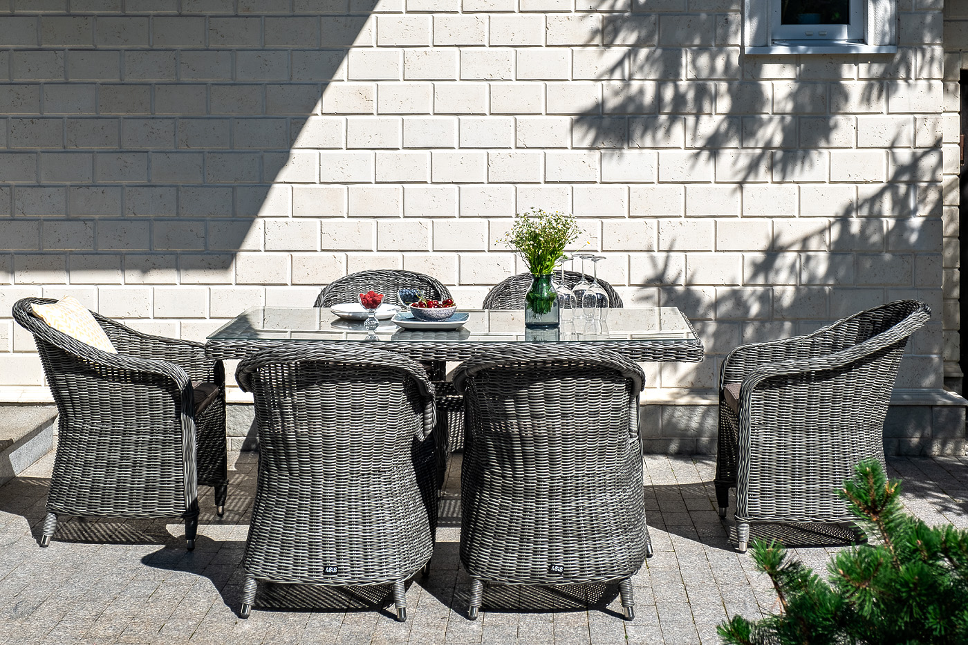 Каркас мебели сделан из прочного алюминия, который выдерживает большие нагрузки. Оплетка выполнена из искусственного ротанга ручного плетения – всесезонного износостойкого материала. Он может долго находиться под солнечными лучами и даже при низких температурах.