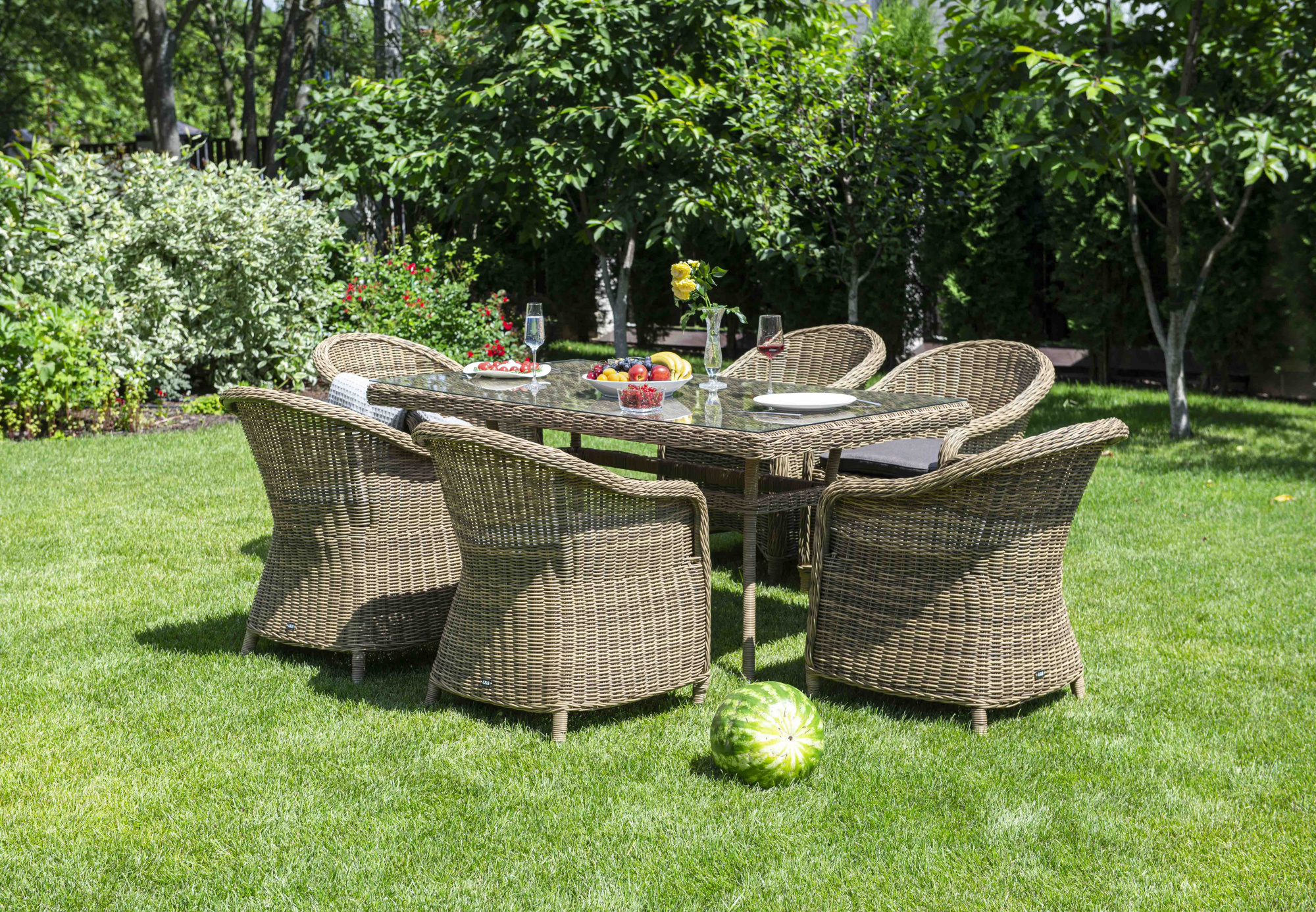 Стекля "Латте" плетеный стол из искусственного ротанга 160х90см, цвет соломенный 1шт. 1 600Х900Х750, "Равенна" плетеное кресло из искусственного ротанга, цвет соломенный 6шт. 570Х680Х810,