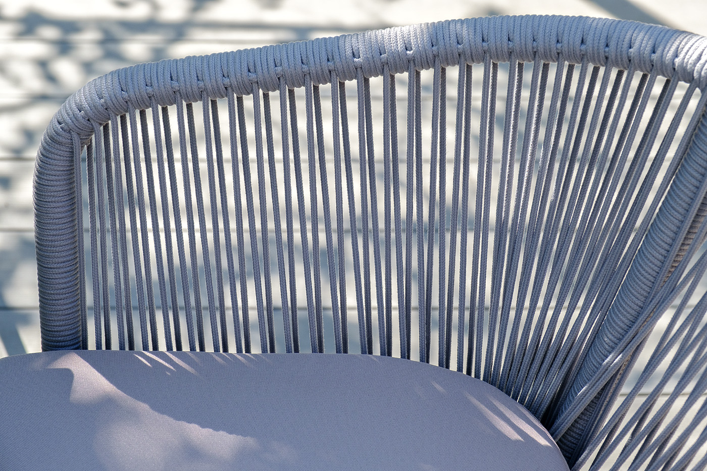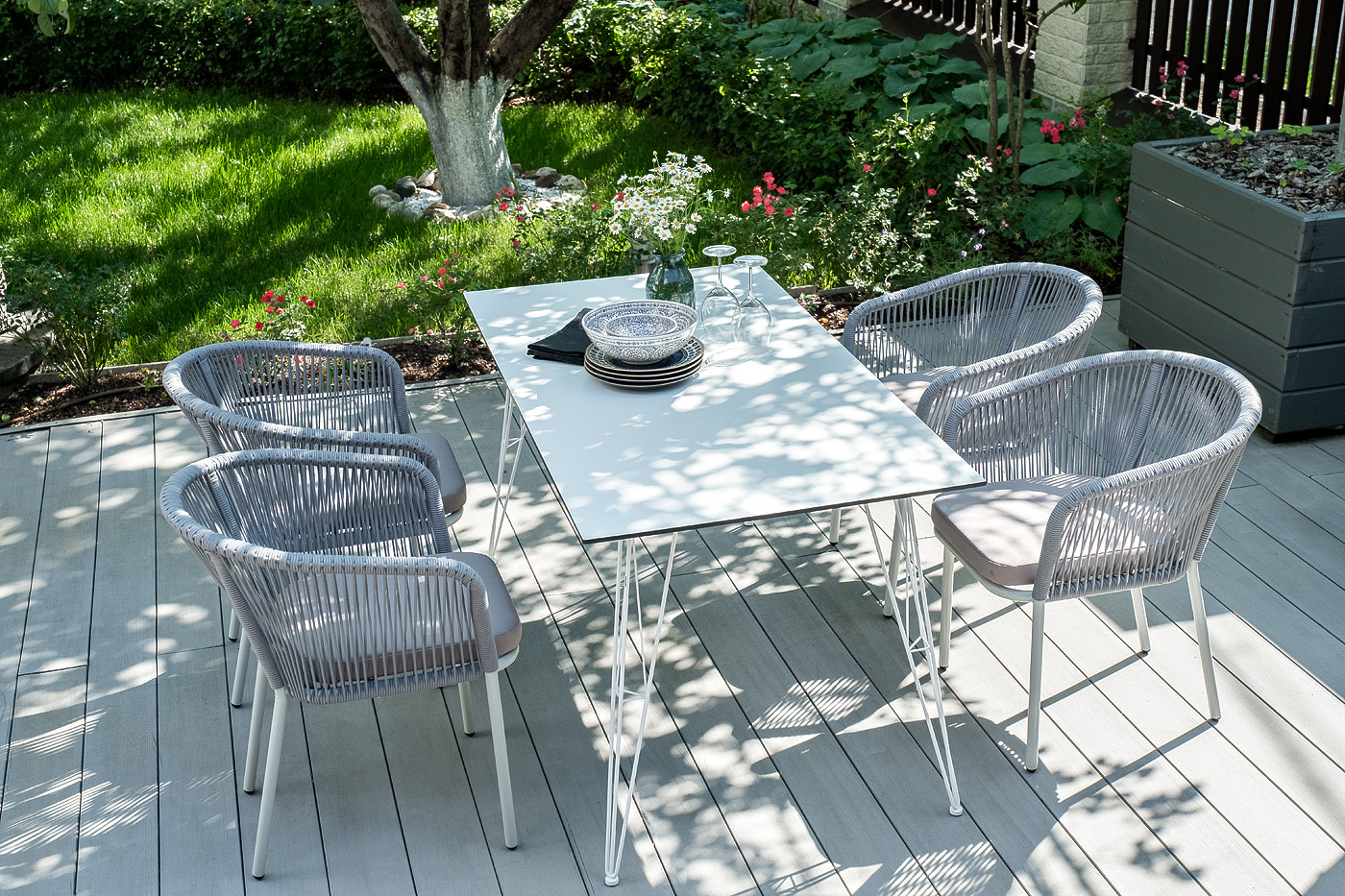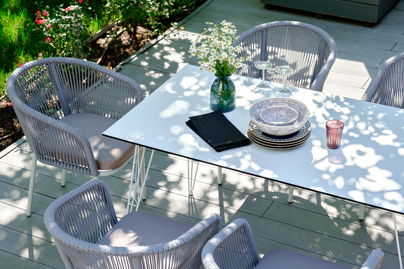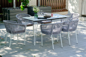 Каркас стульев белого цвета - алюминиевый, оплетен вручную современным материалом - роупом светло-серого оттенка. Это эластичные синтетические ленты из высокопрочных полиэфирных волокон. В комплект входят подушки со съёмными водоотталкивающими чехлами. "Руссо" обеденный стол из HPL 150х80см, цвет "молочный" 1шт. 1 500Х800Х750, "Марсель" стул плетеный из роупа, каркас алюминий белый муар, роуп светло-серый круглый, ткань светло-серая 6шт. 570Х620Х775,