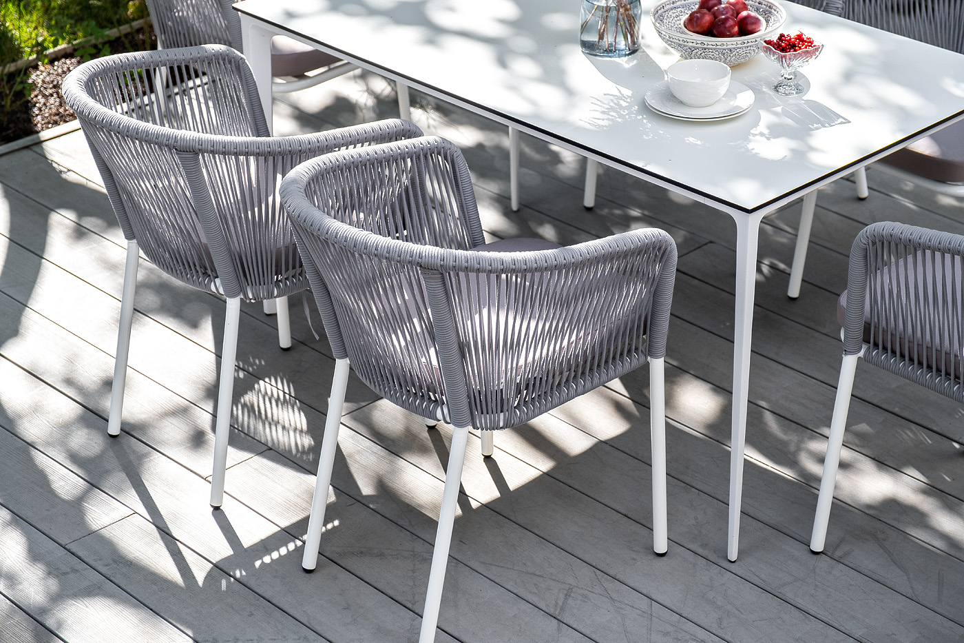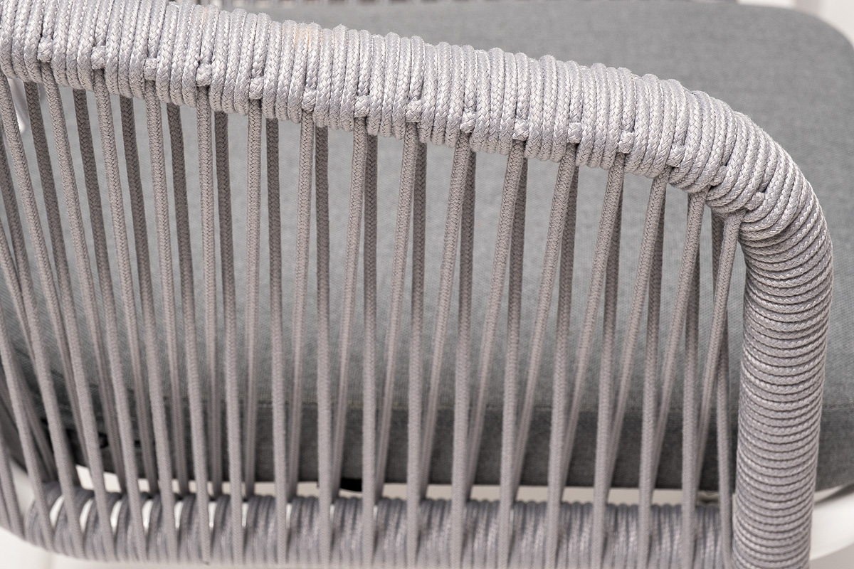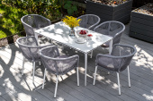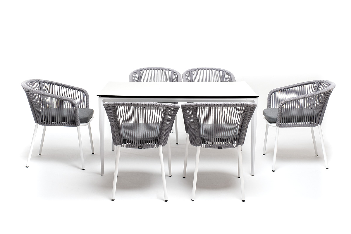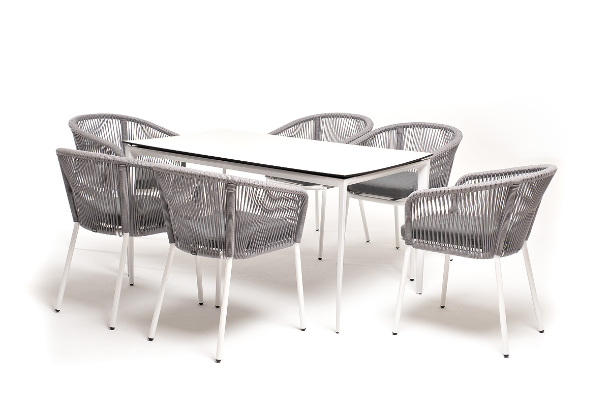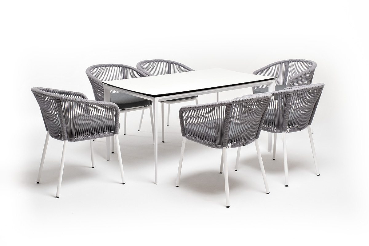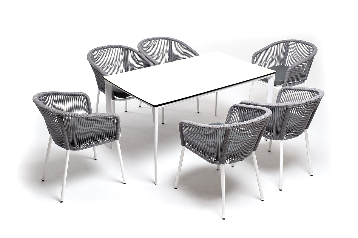 - 6 плетеных стульев «Марсель» из роупа, размером - 570×620×775 мм, цвет роупа - светло-серый, каркас - белый. "Малага" обеденный стол из HPL 140х80см, цвет молочный, каркас белый 1шт. 1 400Х800Х750, "Марсель" стул плетеный из роупа, каркас алюминий белый муар, роуп светло-серый круглый, ткань светло-серая 6шт. 570Х620Х775,