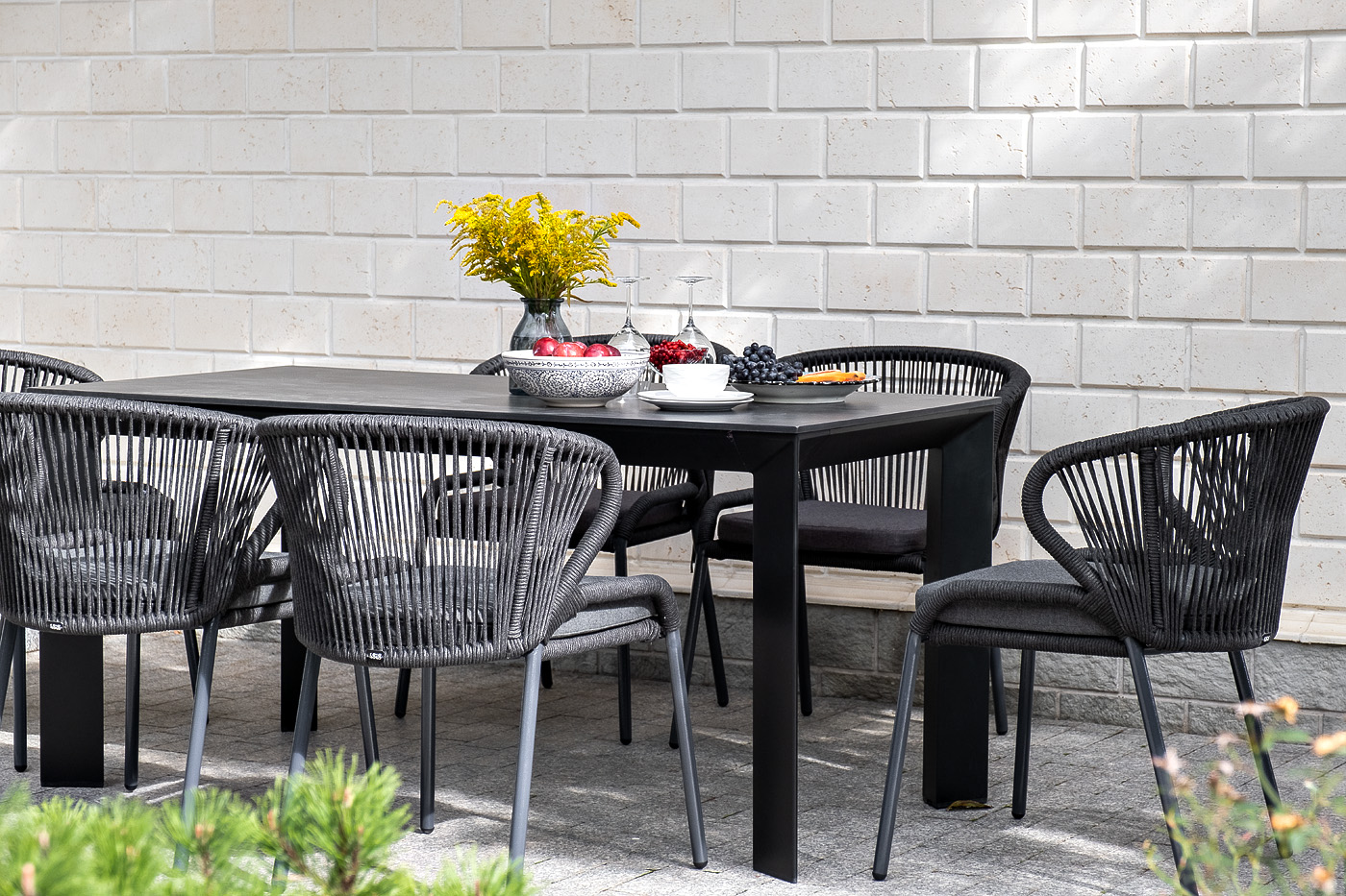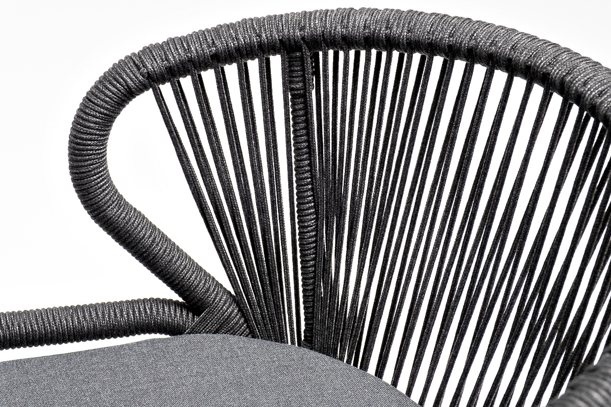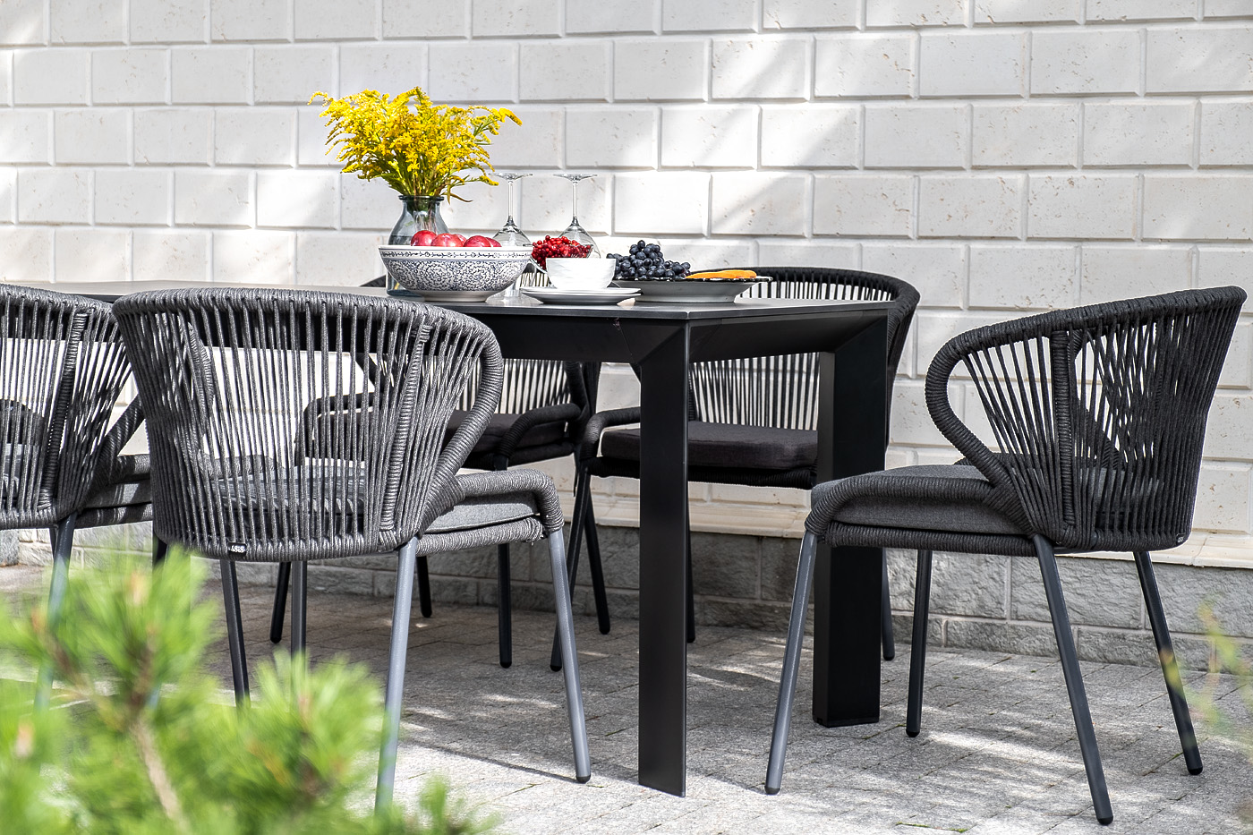 Стулья «Милан» выполнены из роупа темно-серого цвета, который гармонируют с общим дизайном комплекта. Размер каждого стула составляет 570×620×795 мм. Каркас из алюминия придает стульям легкость и прочность, а порошковое окрашивание защищает металл от коррозии и увеличивает срок службы мебели. "Венето" обеденный стол из HPL 160х80см, цвет "серый гранит", каркас черный 1шт. 1 600Х800Х750, "Милан" стул плетеный из роупа, каркас алюминий темно-серый (RAL7024) муар, роуп темно-серый круглый, ткань темно-серая 027 6шт. 600Х660Х795,