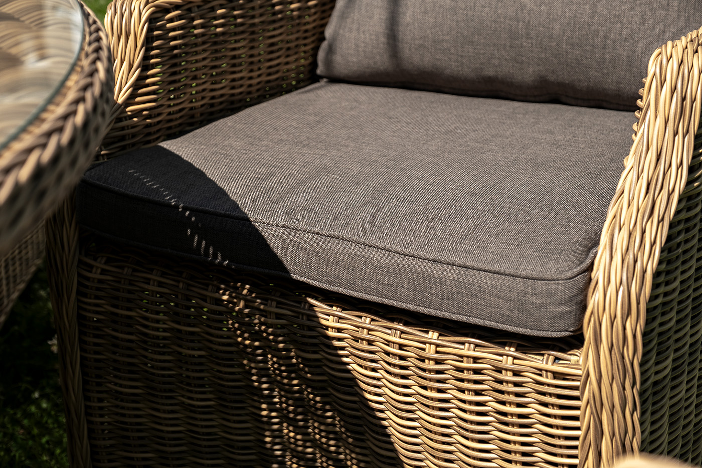 Столешница укомплектована ударопрочным стеклом, толщиной 5 мм. Данное стекло крепится к столу при помощи четырех вакуумных силиконовых присосок и поставляется в собранном виде. Плетеные стулья для удобства использования оснащены подлокотниками и подушками серого цвета на спинках и сидениях. Ткань обработана влагоотталкивающей пропиткой.