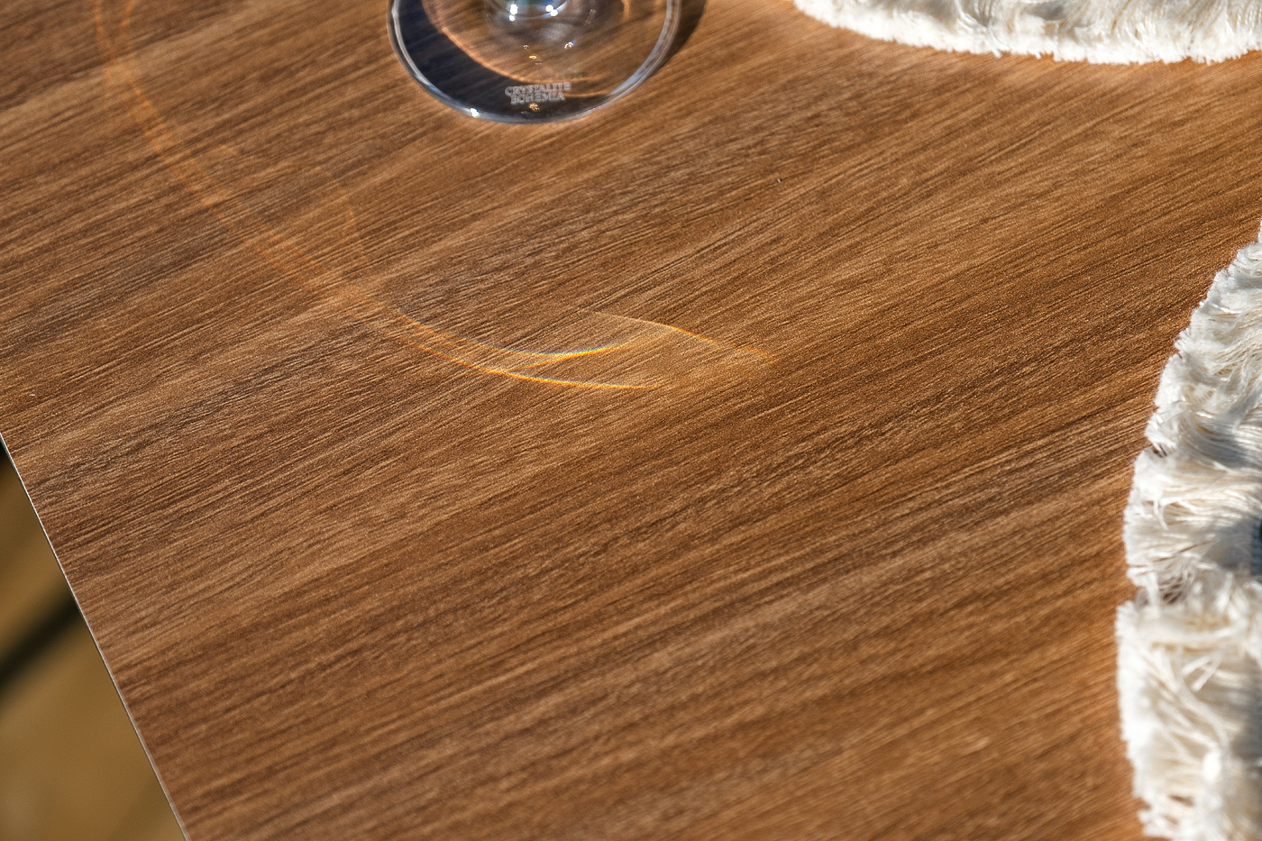 Интерьерный стол изготовлен из металлического подстолья, окрашенного в черный цвет, и столешницы из компактного пластика HPL в цвете «дуб». Благодаря массивному основанию столик устойчив на любых поверхностях.
