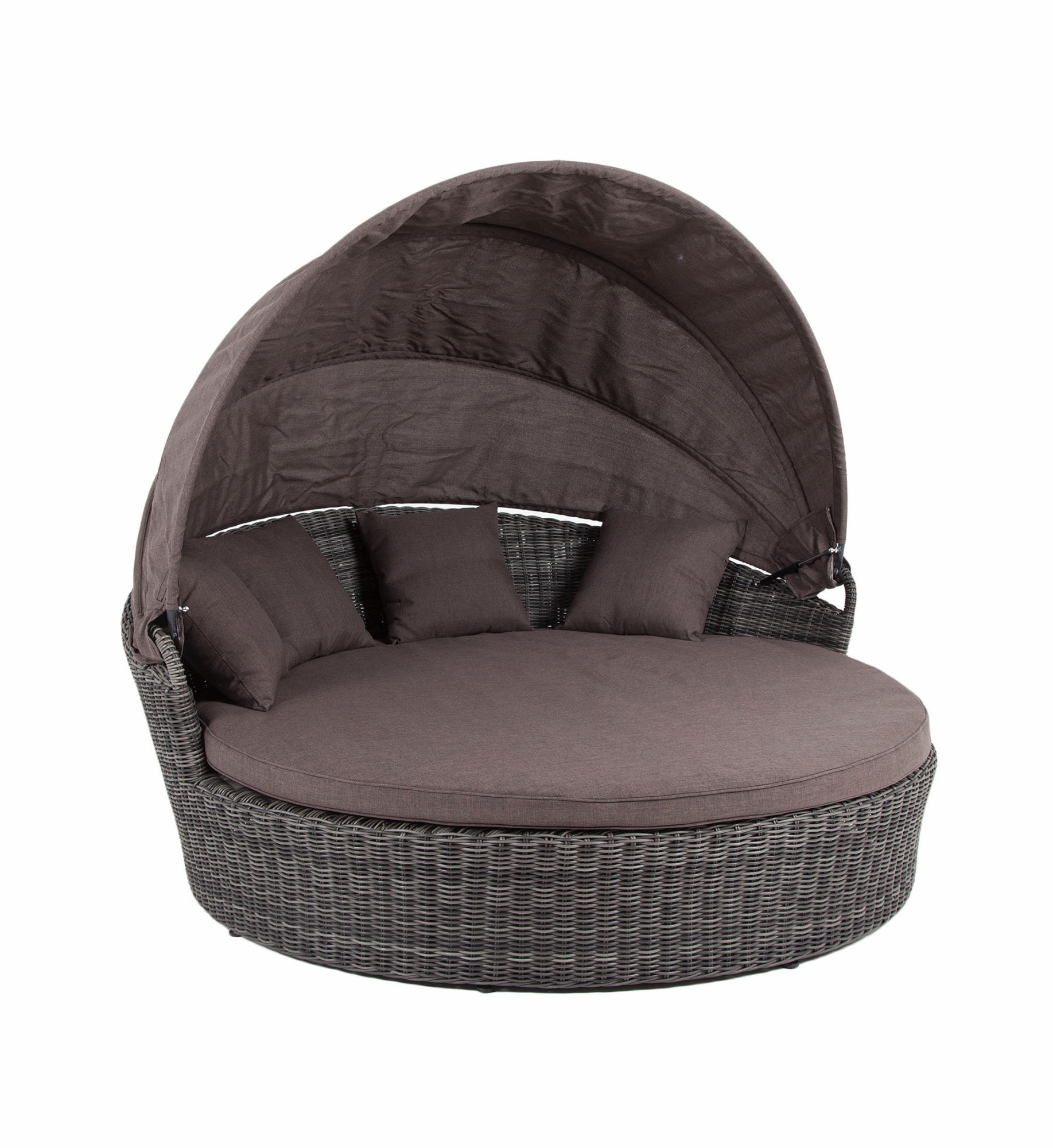Данная модель имеет в основании прочный алюминиевый каркас, оплетенный вручную круглым ротангом и оснащена регулируемым козырьком, который ограничивает попадание солнечных лучей. Выполнен из водостойкой полиэфирной ткани.