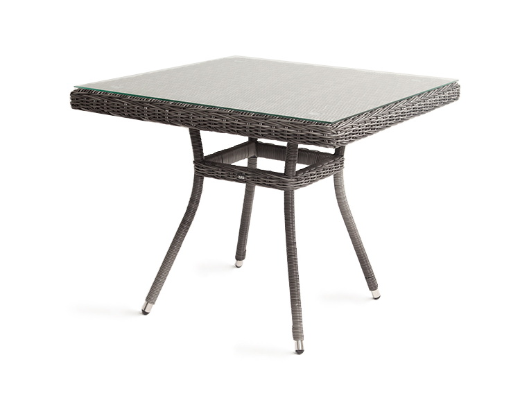 Благодаря столешнице из ударопрочного стекла толщиной 5 мм, можно не опасаясь ставить горячую посуду. Каркас изготовлен из прочного алюминия, оплетенного ротангом графитового цвета.