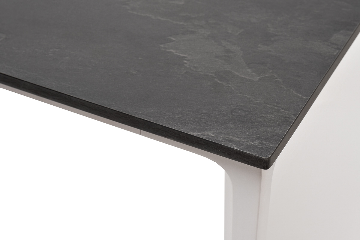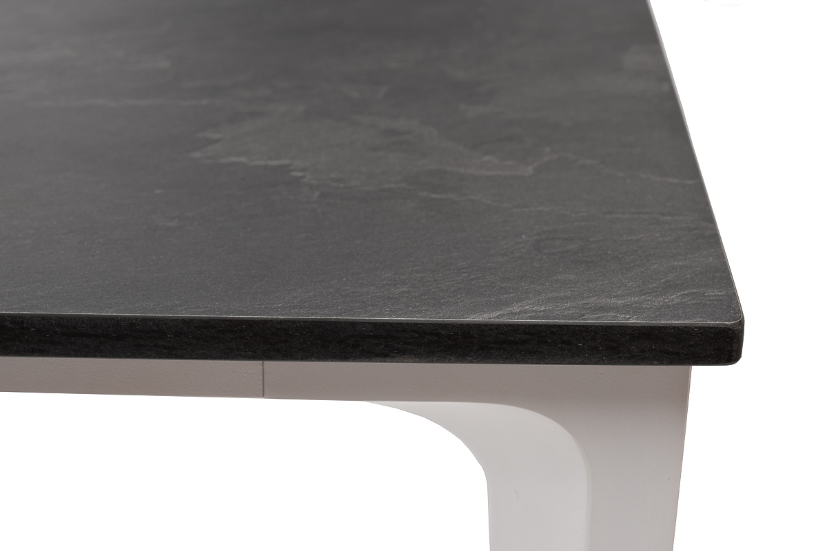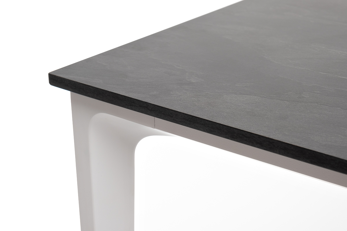 Столешница выполнена из современного высококачественного монолитного компакт-пластик HPL, толщиной 12 мм в цвете «серый гранит». Материал устойчив к высоким температурам, попаданию влаги и может использоваться при любых погодных условиях. Подстолье изготовлено из крашеного алюминия белого цвета.