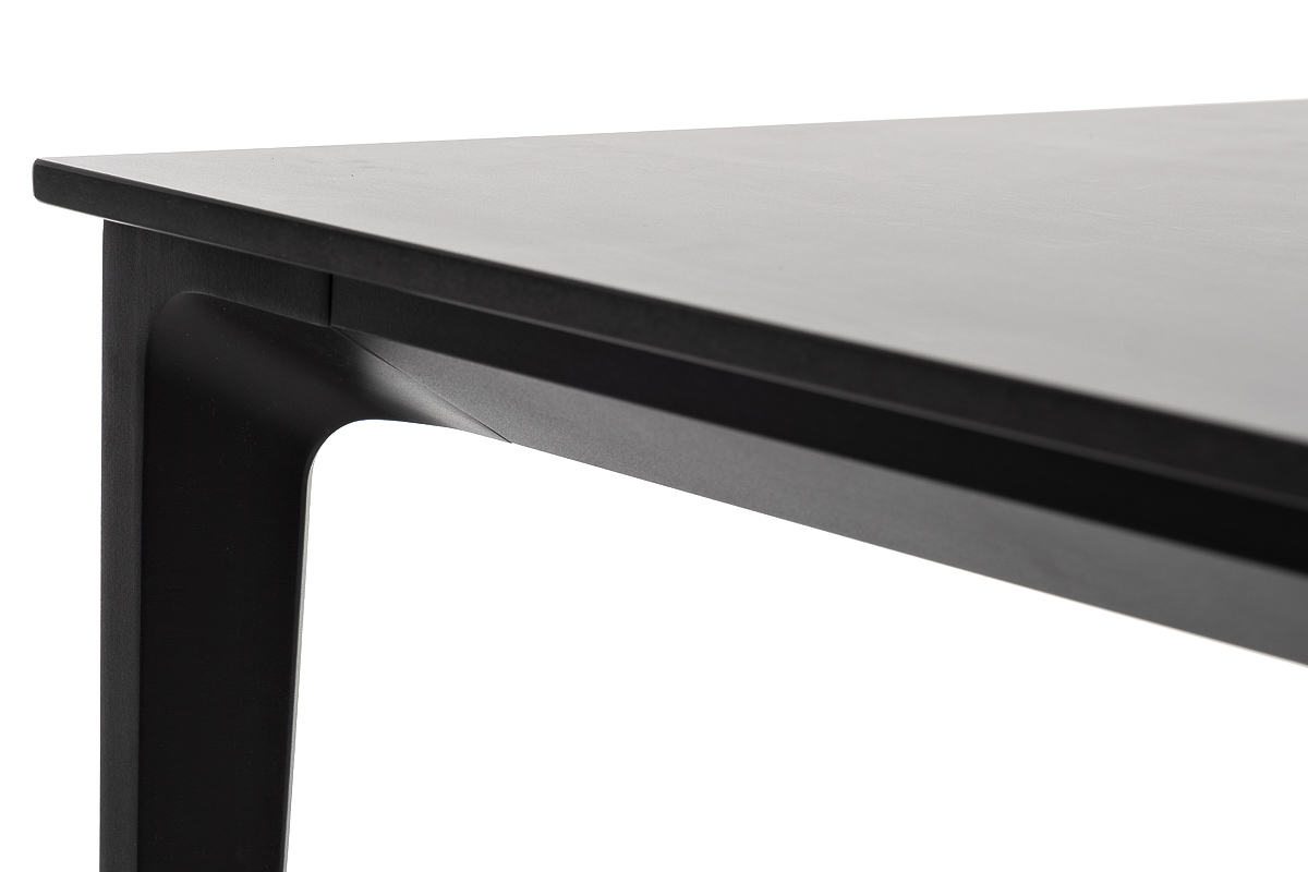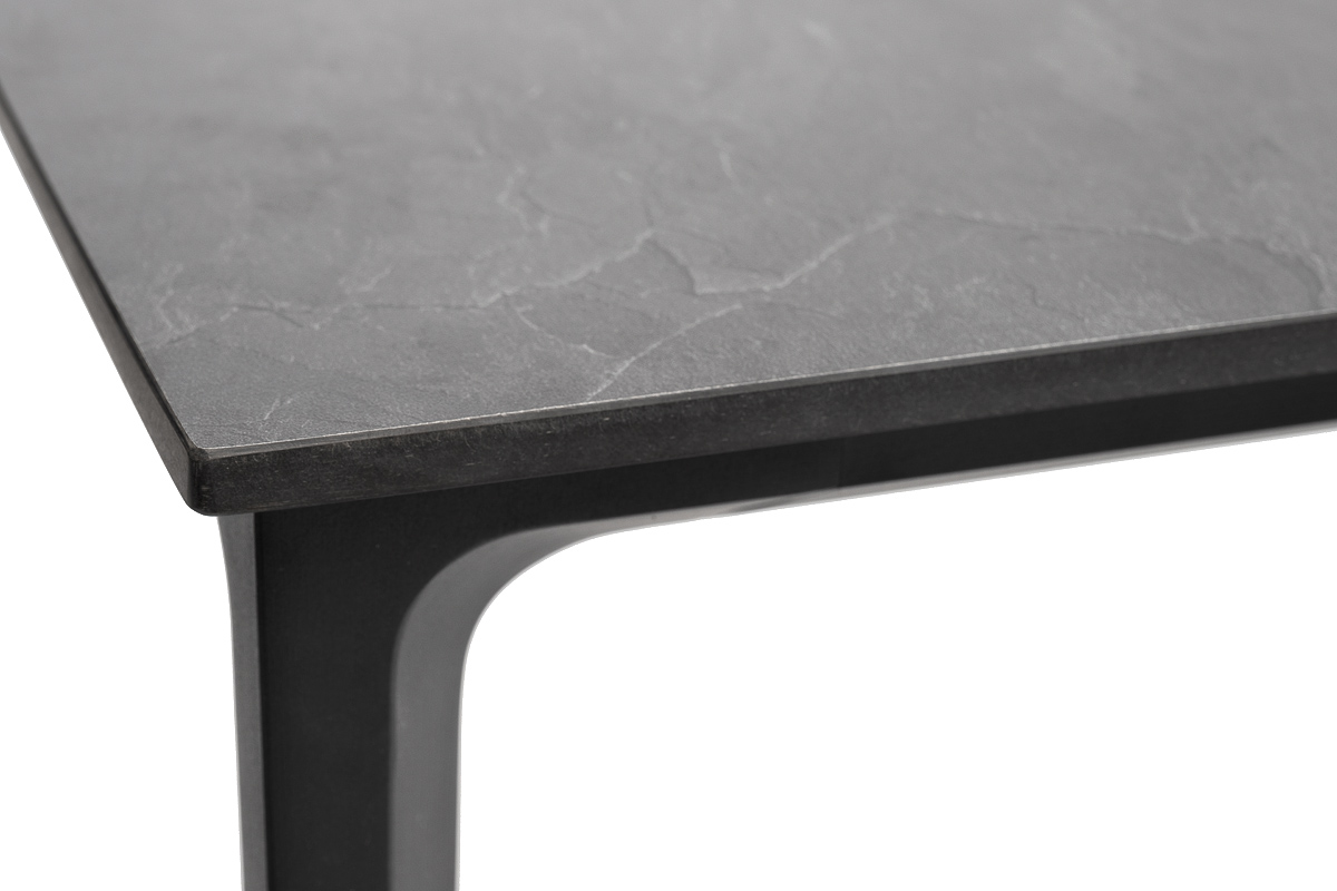 Столешница выполнена из современного высококачественного монолитного компакт-пластик HPL, толщиной 12 мм в цвете «серый гранит». Материал устойчив к высоким температурам, попаданию влаги и может использоваться при любых погодных условиях. Подстолье изготовлено из крашеного алюминия черного цвета.