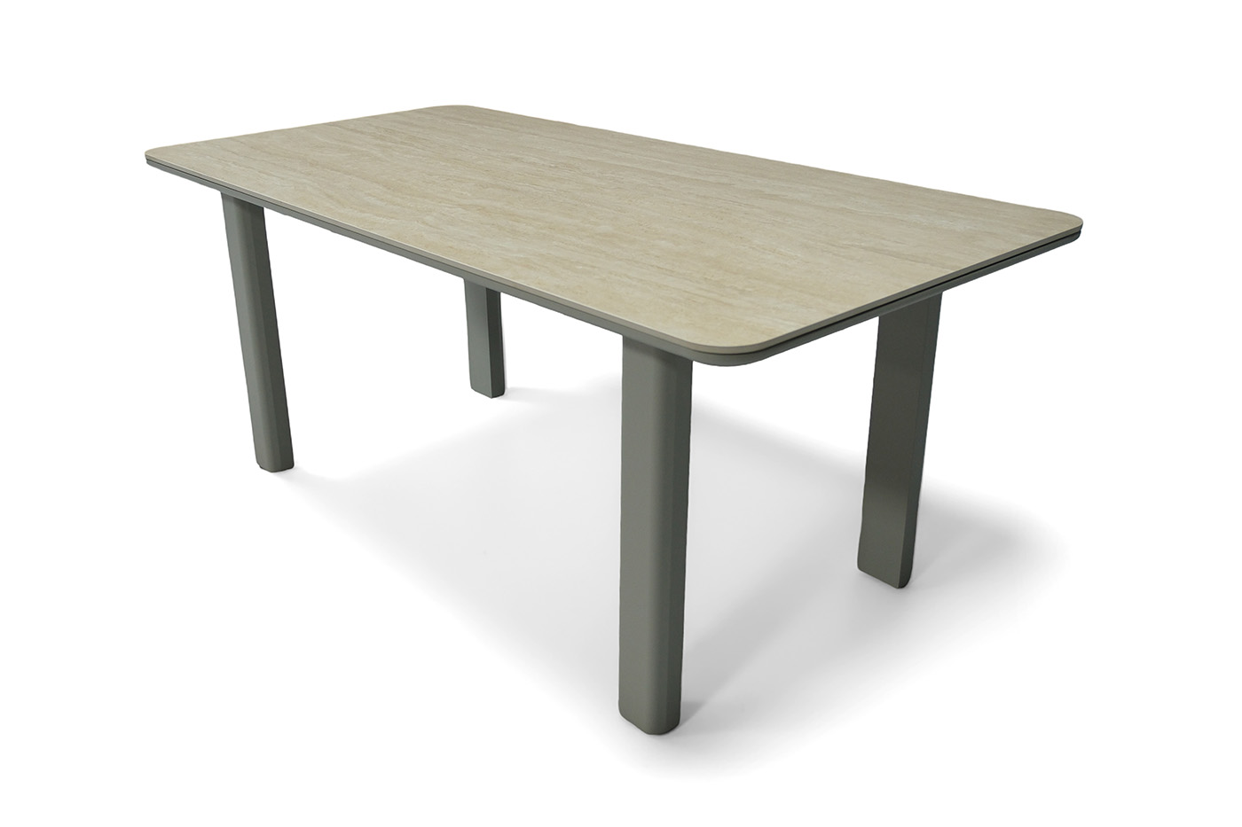 Столешница из искусственного камня в светлом оттенке, а прочное алюминиевое основание в светло‑сером цвете придаёт модели современный акцент. Лаконичные линии и продуманные пропорции делают этот стол идеальным решением для столовой или террасы.