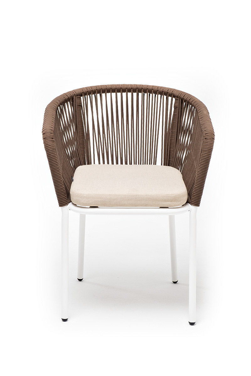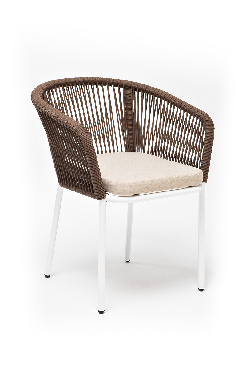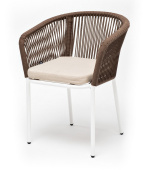"Марсель" стул плетеный из роупа, каркас алюминий белый муар, роуп коричневый круглый, ткань бежевая 052