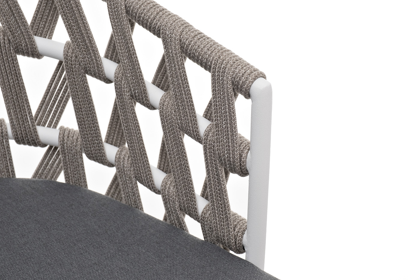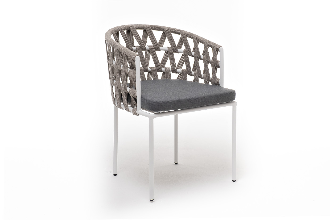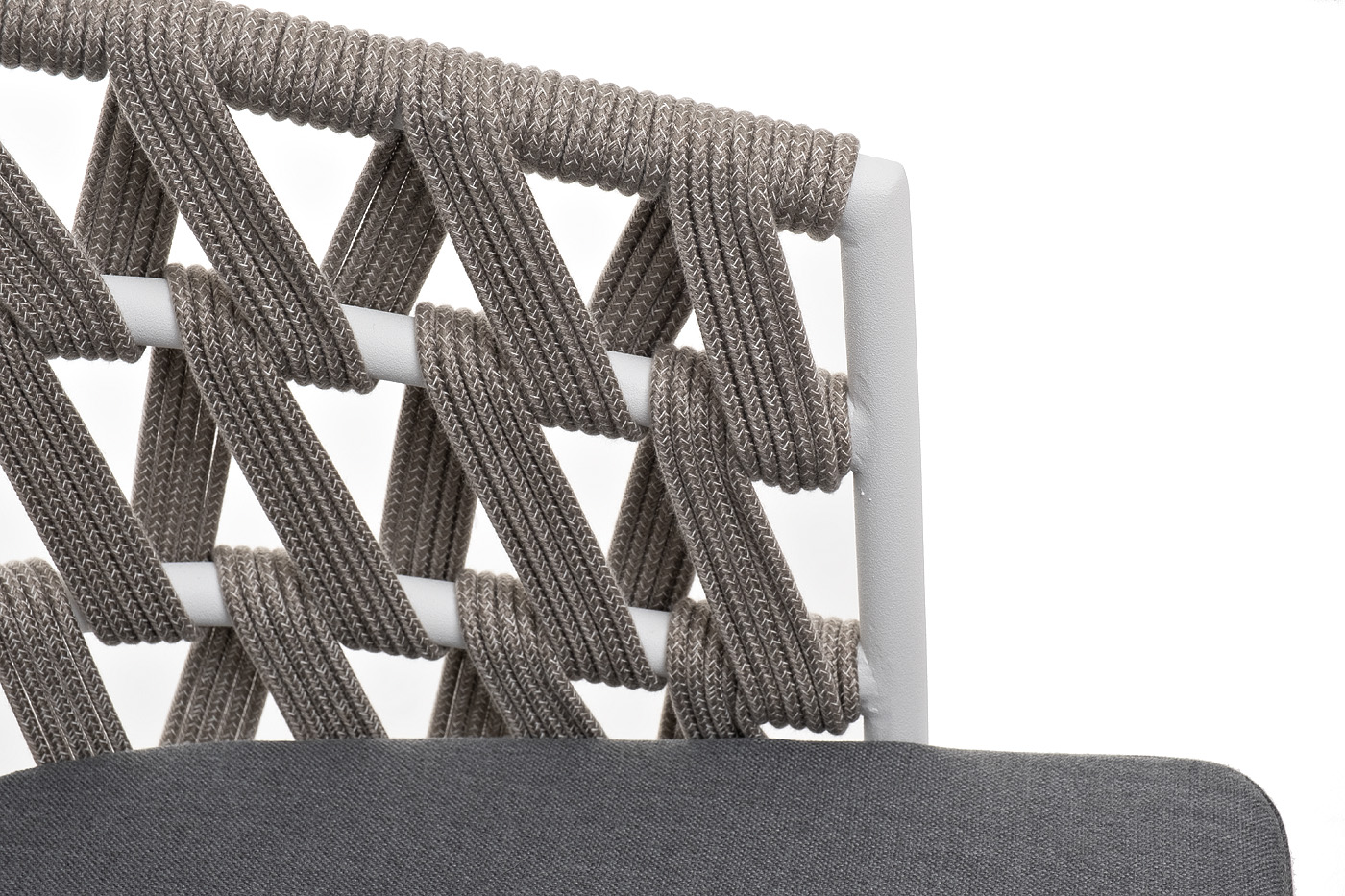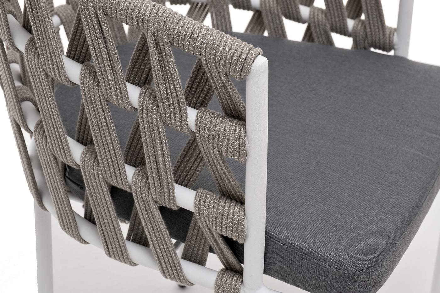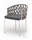 "Диего" стул плетеный из роупа, каркас из стали белый муар, роуп серый меланж круглый, ткань серая 017