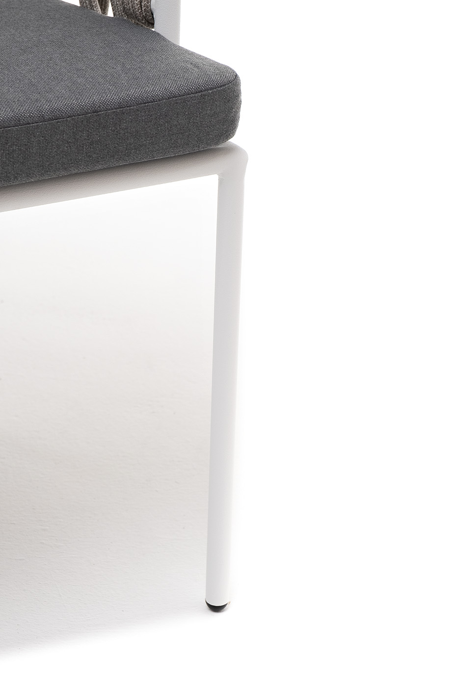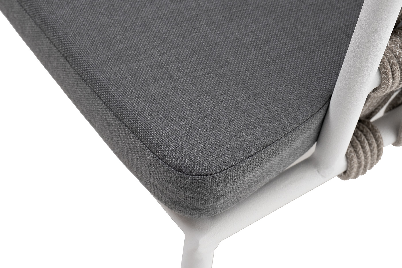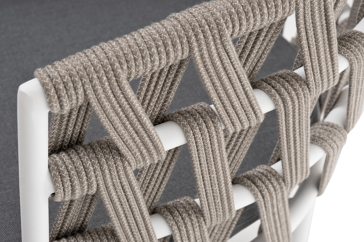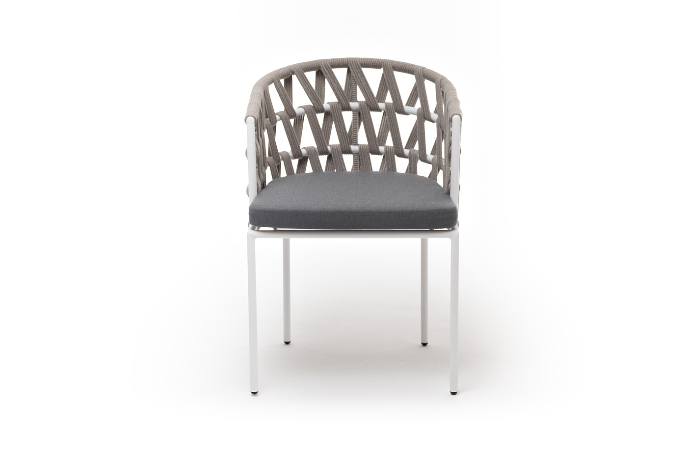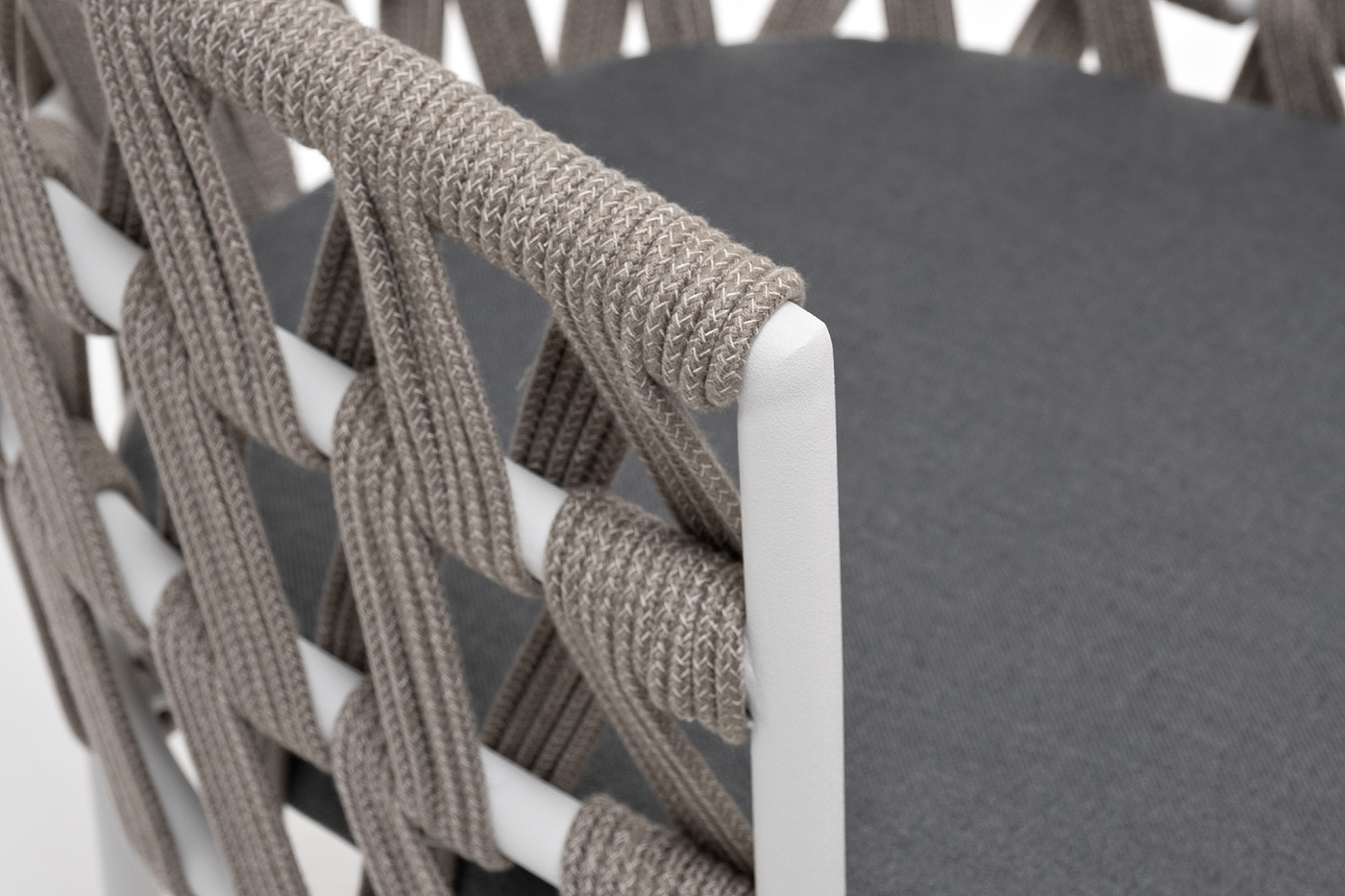 "Диего" стул плетеный из роупа, каркас из стали белый муар, роуп серый меланж круглый, ткань серая 017