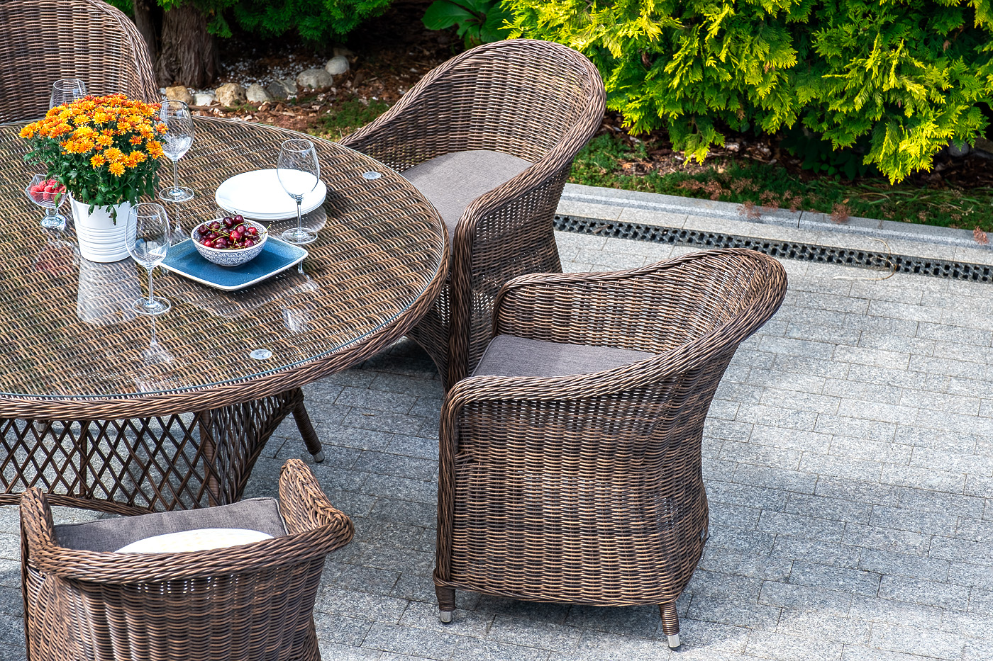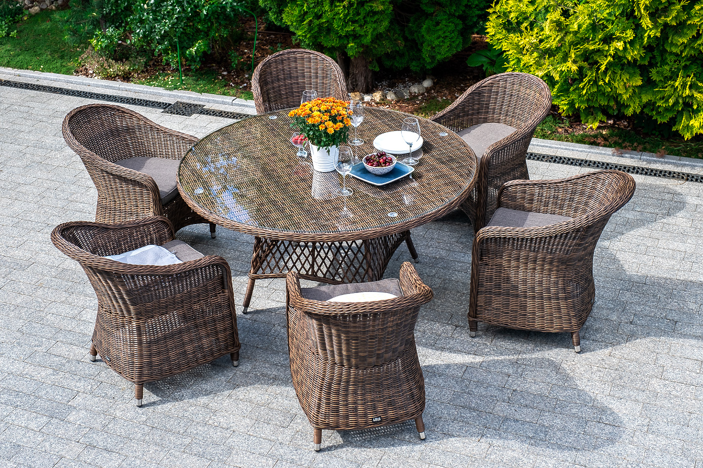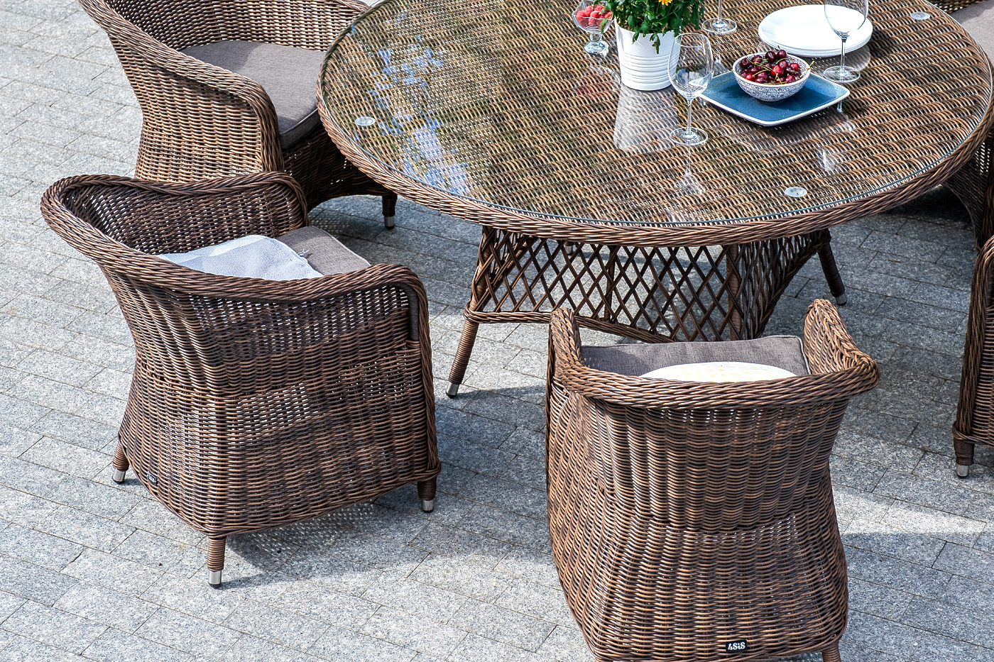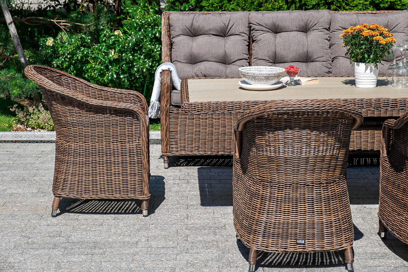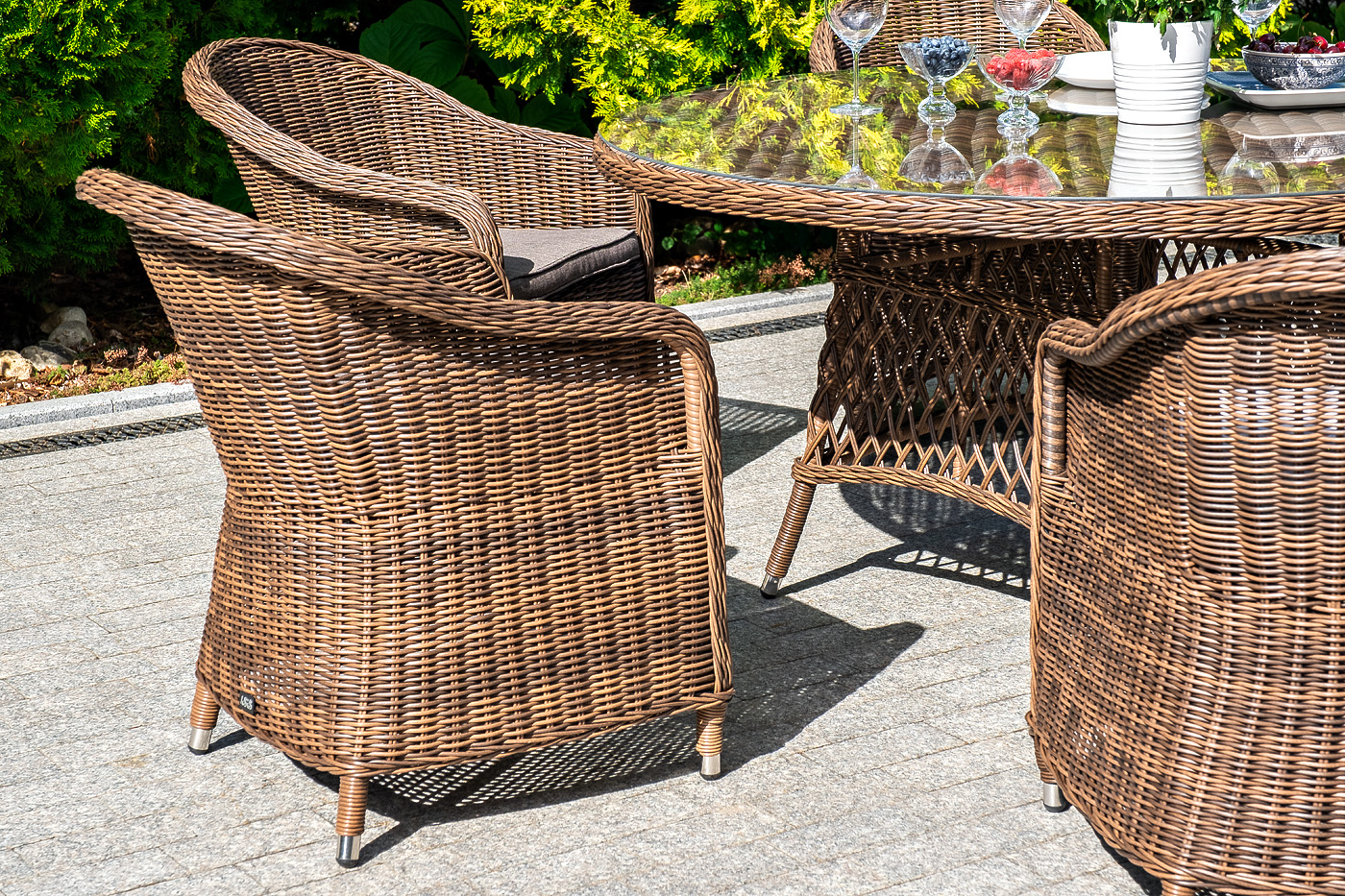 Кресло изготовлено посредством ручного плетения из искусственного ротанга коричневого цвета. Для укрепления конструкции использован алюминиевый каркас. Благодаря ему плетеное кресло остается легким, но прочным.