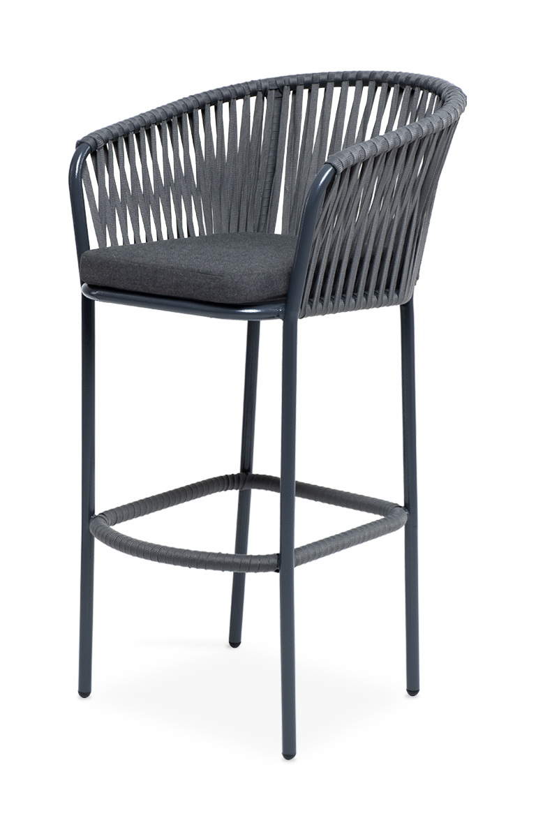 "Бордо" стул барный плетеный из роупа, каркас из стали темно-серый (RAL7024) муар, роуп серый 15мм, ткань темно-серая 027