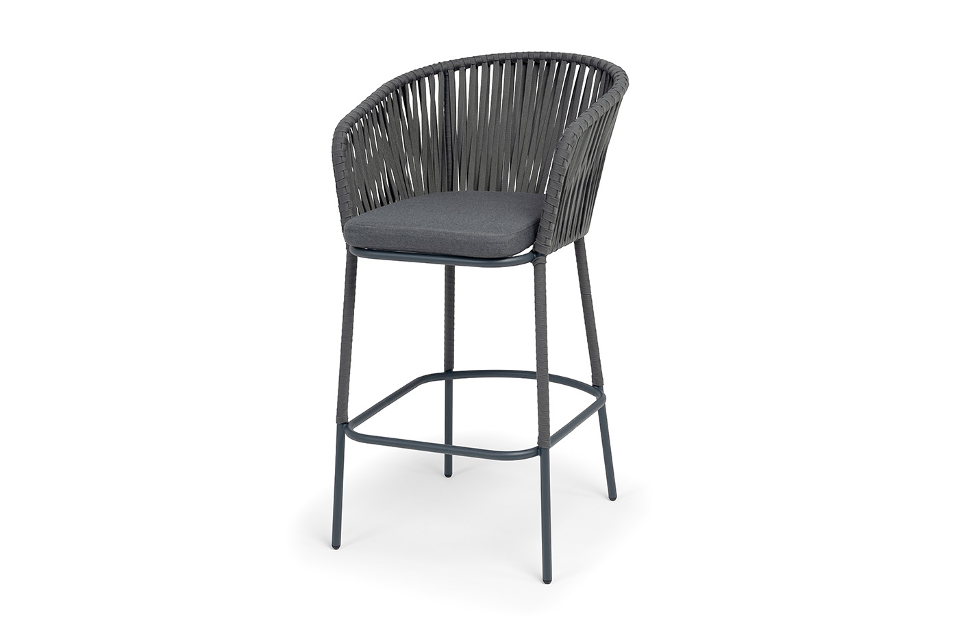 "Бордо" стул барный плетеный из роупа, каркас из стали темно-серый (RAL7024) муар, роуп серый 15мм, ткань темно-серая 027 NEW
