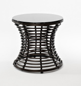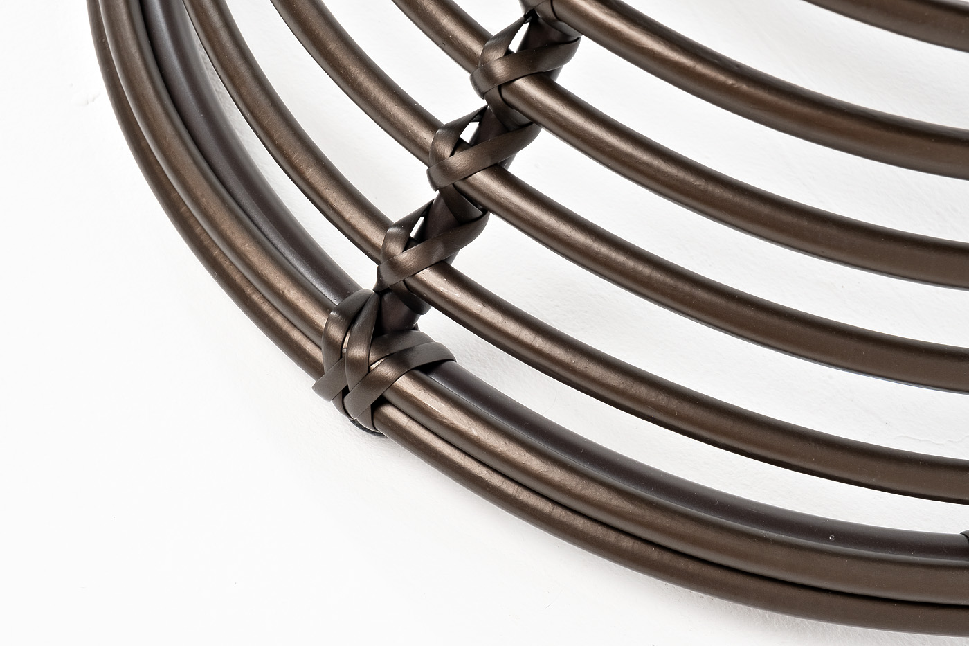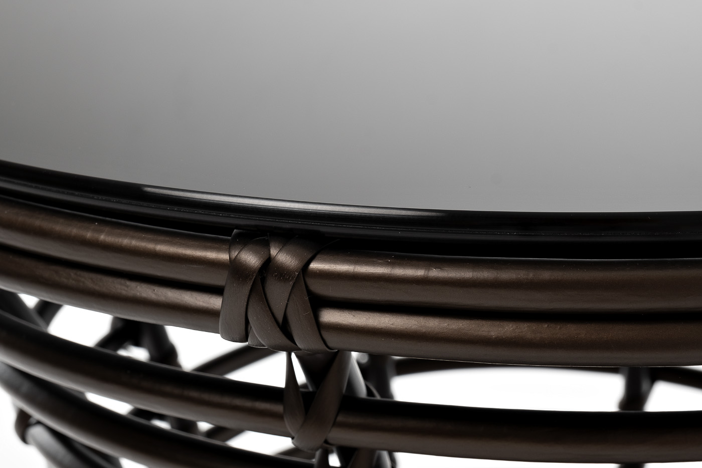 Каркас столика изготовлен из алюминия, вручную оплетенного круглым искусственным ротангом.