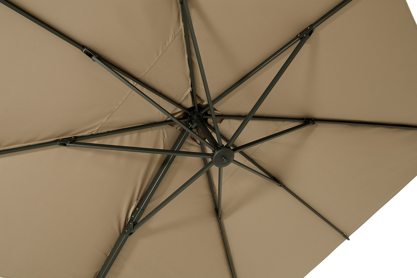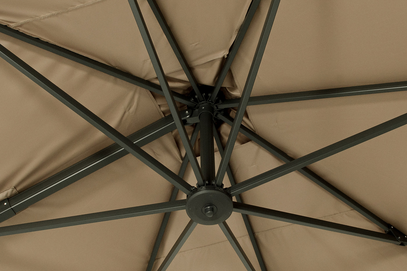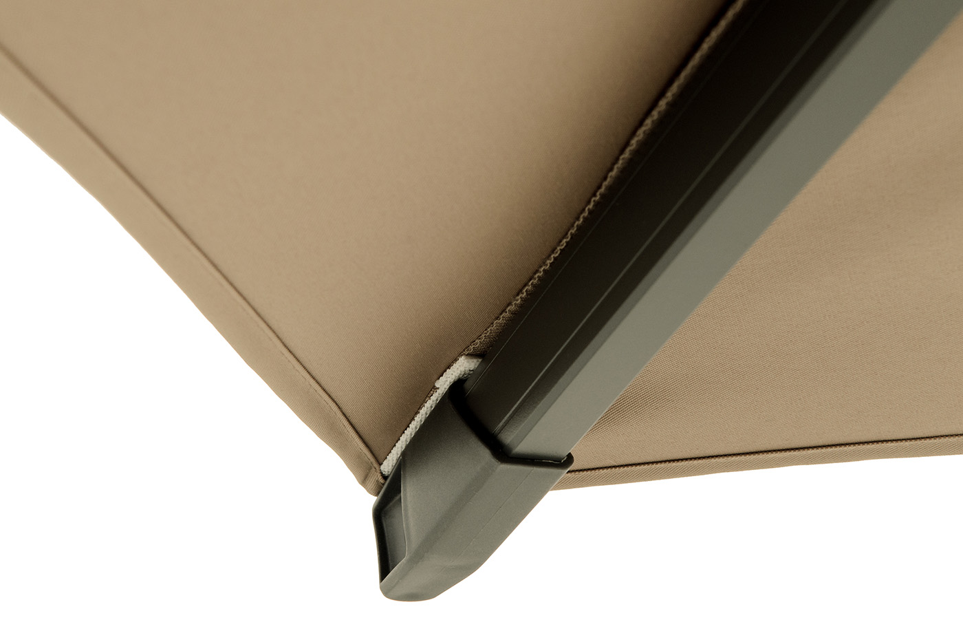 Тент уличного зонта изготовлен из прочного 100% полиэстера с водоотталкивающей пропиткой, что гарантирует защиту не только от солнца, но и осадков в виде дождя.