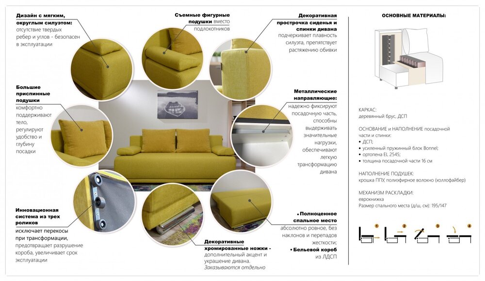 Механизм раскладки: Еврокнижка. Каркас: ДСП (Kronospan, класс Е1), Шлифованный брус хвойных пород дерева, Направляющие из фанеры. Сиденье: Усиленный пружинный блок боннель, Эластичная пена марки EL