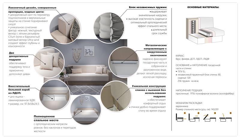 - Дополнительные функции. Часть моделей оснащена вместительными ящиками для хранения белья, съёмными подушками и другими практичными элементами, которые делают использование дивана ещё более удобным.