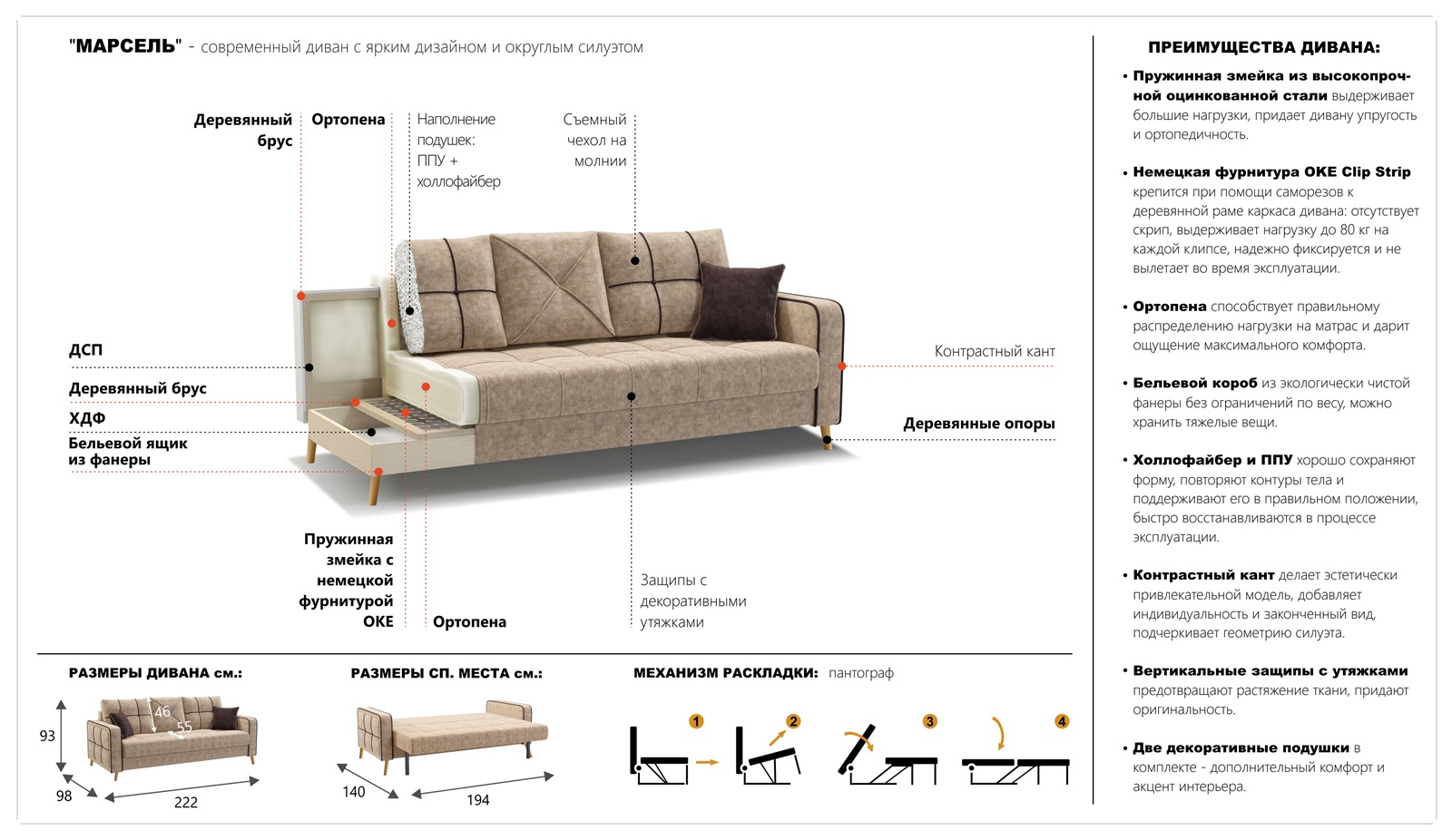- Качественные материалы и долговечность. Каркасы диванов изготовлены из прочных и надёжных материалов — дерева, фанеры, ЛДСП. В качестве наполнителя используется качественный ППУ и синтепон, обеспечивающие комфорт и устойчивость к нагрузкам. Обивка отличается износостойкостью и простотой в уходе.