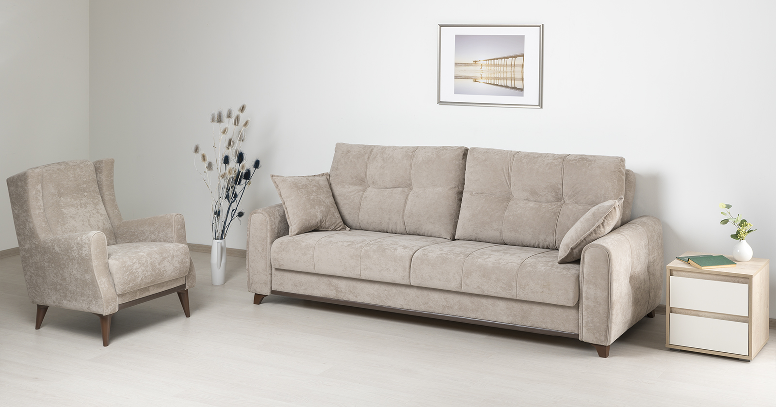 высота спинки (мм): 540, высота подлокотника от сиденья (мм): 180. Максимально допустимая нагрузка: 80 кг на одно посадочное место, 100 кг на одно спальное место. Механизм трансформации: Книжка с 0 стеной. Бельевой ящик с перегородкой по центру (2 отделения), размер отделения (Д x Ш, мм): 890 x 840 x 200. Варианты исполнения: 5 артикулов, сочетание тканей только как на фото, основная ткань: Романс (велюр) / Марвел (кож.зам). Каркас: фанера, деревянный брус, ДСП, ЛДСП, ДВПо. Основание сиденья: ППУ на блоке плоских пружин "змейка", основание матраса: ППУ на блоке плоских пружин "змейка". Приспинные подушки, шт: 2, съемные чехлы приспинных подушек: есть, декоративные подушки, шт: 2, наполнитель подушек: крошка ППУ и полиэфирное волокно «шарики». Материал опор: пластик, цвет опор: коричневый, высота опор (мм): 80. Декор: защипы на подушках и подлокотниках с утяжкой на 2 пуговицы из осн. материала, защипы на сидушке, декоративный кант на передних торцах подлокотников.