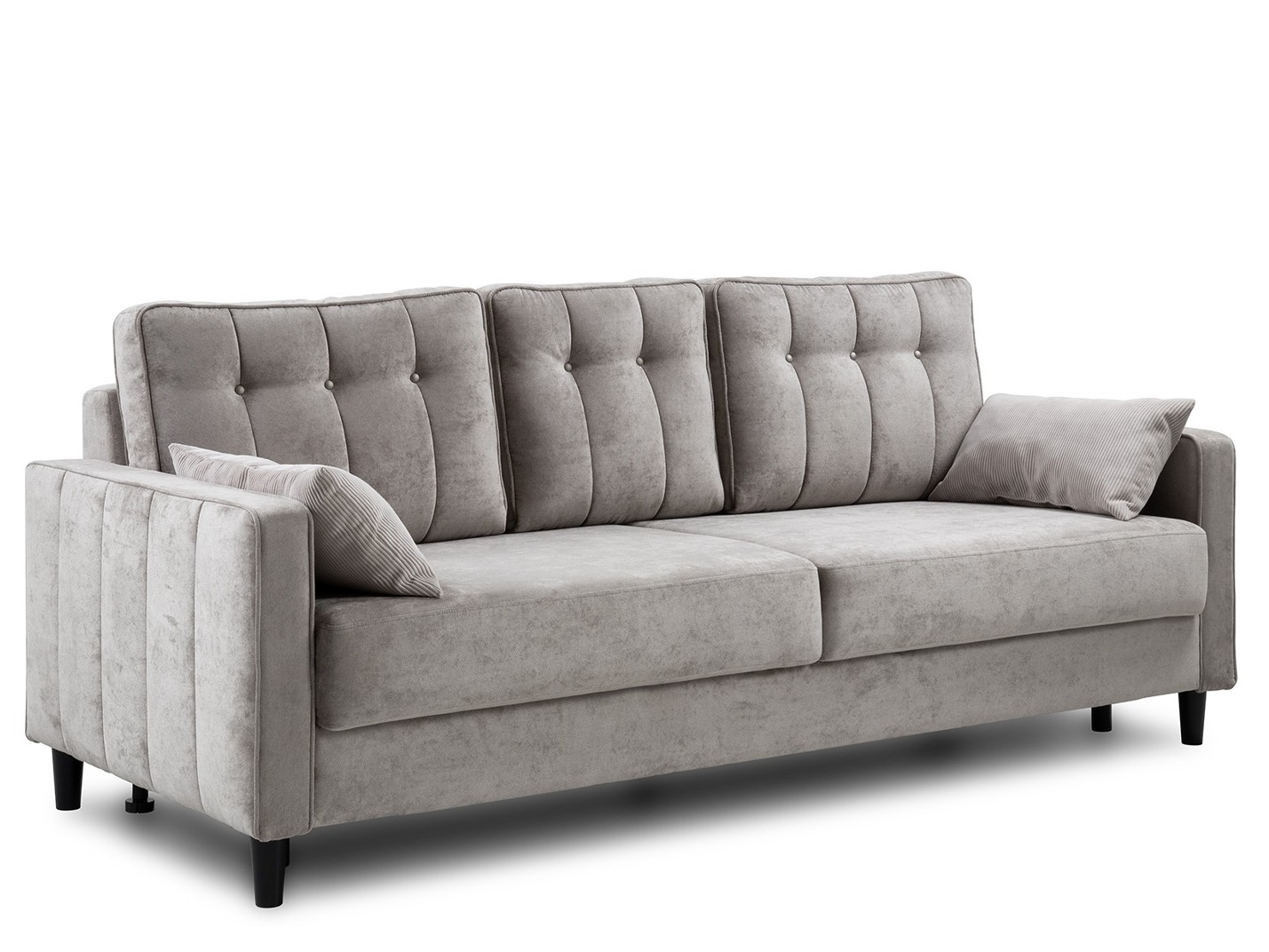 Механизм трансформации: Еврокнижка с механизмом раскладки «тик-так». Бельевой ящик есть, с перегородкой по центру (2 отделения), размер отделения (Д x Ш, мм): 786 x 688 x 150; Варианты исполнения: 5 артикулов, сочетание тканей только как на фото; Материалы: основная ткань: Лаки (велюр); Каркас: фанера, деревянный брус, ДСП, ДВП, декоративные подушки, шт: 2 наполнитель подушек: крошка ППУ и полиэфирное волокно «шарики»; материал опор: лакированное дерево; цвет опор: черная эмаль; высота опор (мм): 120; Подушки имеют трапециевидную форму, с утолщением к низу для комфорта посадки. Кант по всему периметру подушек, декоративные утяжки металлическими пуговицами, вертикальная стежка.