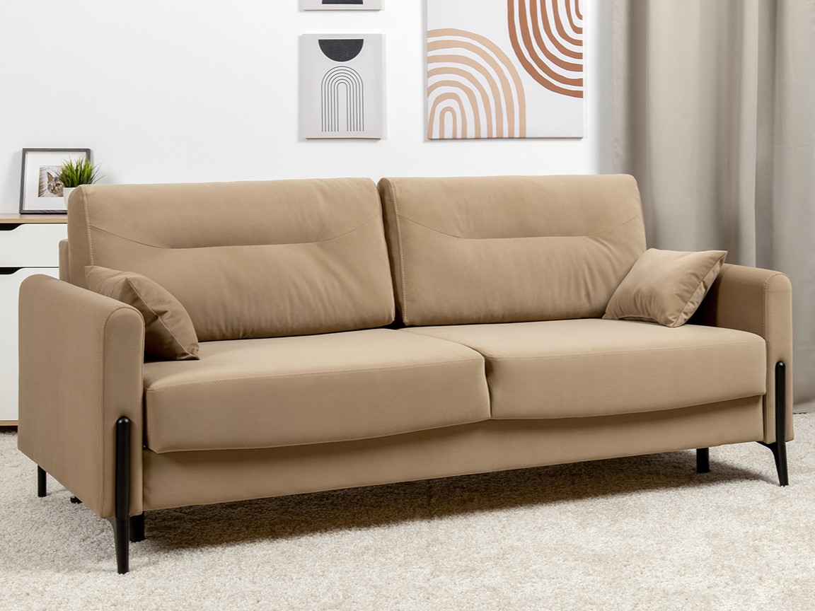 Каркас: фанера, деревянный брус, ДСП, ДВП; приспинные подушки, шт: 2, декоративные подушки, шт: 2, наполнитель подушек: полиэфирное волокно «шарики»; материал опор: металл, цвет опор: черный; высота опор (мм): 150. Металлические опоры плавно переходят в декоративный элемент подлокотника. Декоративная утяжка.