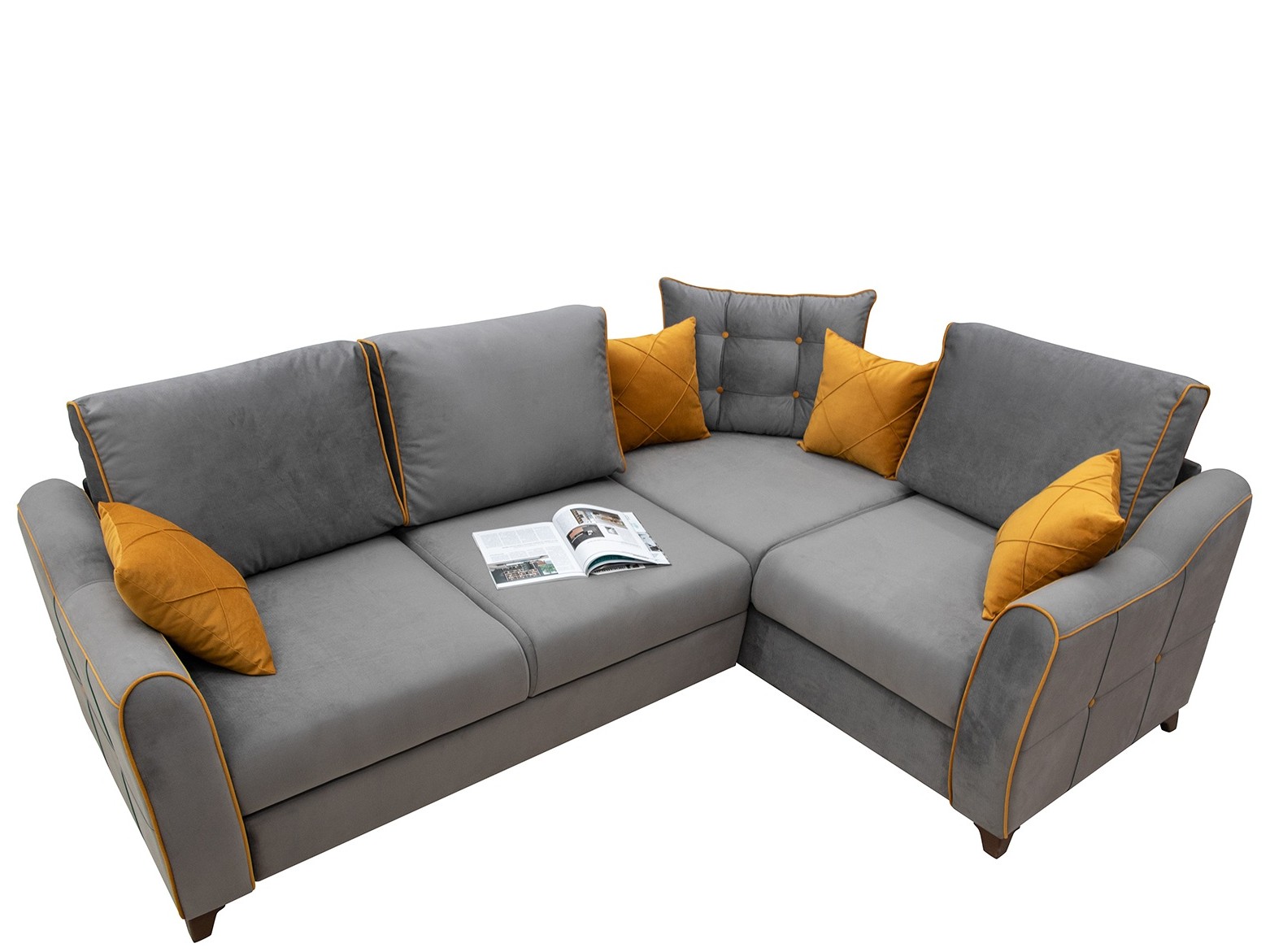 Габариты: сложенный (Д x Г х В, мм): 2440 x 1770 x 930, разложенный (Д x Г х В, мм): 2440 x 1770 x 770, спальное место (Д x Ш, мм): 2220 x 1560, высота посадки (мм): 480. Максимально допустимая нагрузка: 80 кг на одно посадочное место, 100 кг на одно спальное место. Механизм трансформации: Дельфин «Калипсо» на металлокаркасе. Бельевой ящик в оттоманке, одно отделение, размер отделения (Д x Ш, мм): 1533 x 770 x 200. Есть возможность самостоятельной сборки на любую сторону. Варианты исполнения: 6 артикулов, сочетание тканей только как на фото, основная ткань: Амиго (велюр). Каркас: фанера, деревянный брус, ДСП, ДВП, ЛДСП, ДВПо. Основание сиденья: ППУ на блоке плоских пружин "змейка". Приспинные подушки, шт: 4. Декоративные подушки, шт: 4. Наполнитель подушек: крошка ППУ и полиэфирное волокно «шарики» . Материал опор: пластик. Цвет опор: коричневый. Декоративный кант, пуговицы, отстрочка, утяжки на подушке и подлокотниках.