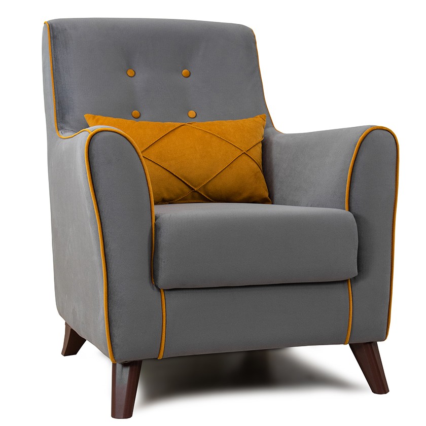 Габариты: (Д x Г х В, мм): 750 x 870 x 890, высота посадки (мм): 460, глубина сиденья (мм): 440. Максимально допустимая нагрузка: 100 кг. Варианты исполнения: 9 артикулов, сочетание тканей только как на фото, основная ткань: Амиго (велюр). Каркас: фанера, деревянный брус, ДСП. ДВП. Основание сиденья: ППУ на блоке плоских пружин "змейка". Декоративные подушки, шт: 1. Наполнитель подушек: крошка ППУ и полиэфирное волокно «шарики» . Материал опор: пластик. Цвет опор: коричневый, высота опор (мм): передние 120 мм; задние 100 мм. Декоративный кант на кресле, защипы на декоративной подушке, пуговицы на спинке.