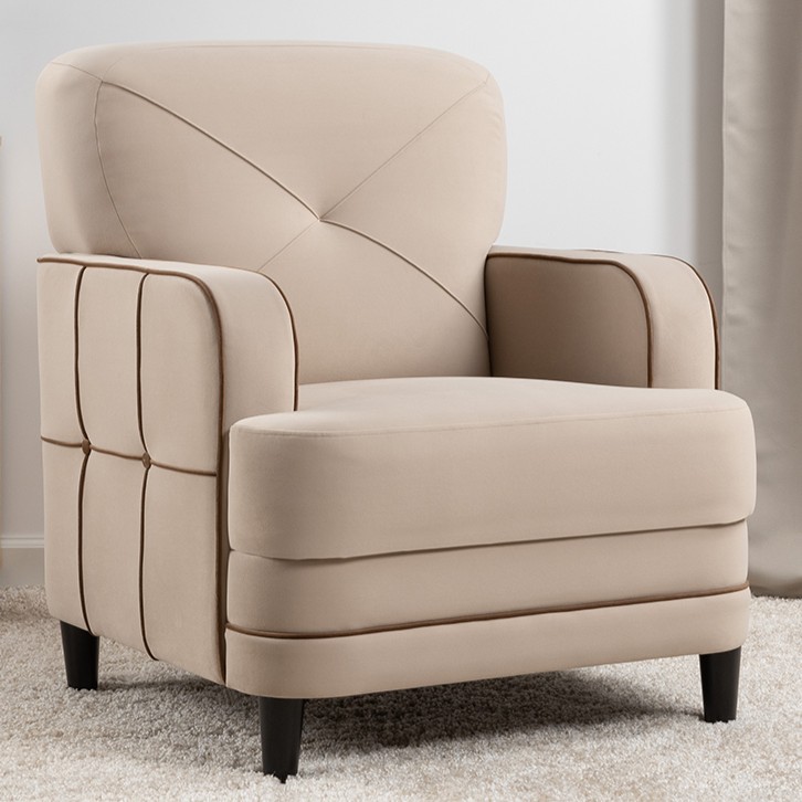 Габариты: (Д x Г х В, мм): 780 x 930 x 830, высота посадки (мм): 480, глубина сиденья (мм): 530, высота спинки (мм): 520, высота подлокотника от сиденья (мм): 200, максимально допустимая нагрузка: 100 кг. Варианты исполнения: 3 артикула, сочетание тканей только как на фото, основная ткань: Irida (велюр). Каркас: фанера, деревянный брус, ДСП, МДФ. Основание сиденья: ППУ на блоке плоских пружин "змейка". Материал опор: пластик. Цвет опор: черный, высота опор (мм): 120. Декоративные канты на вставке подлокотников. Пуговицы в местах пересечения кантов на подушке и вставке подлокотников. По торцам подлокотников и думках контрастный декоративный кант. Защипы на сиденье и подушке.