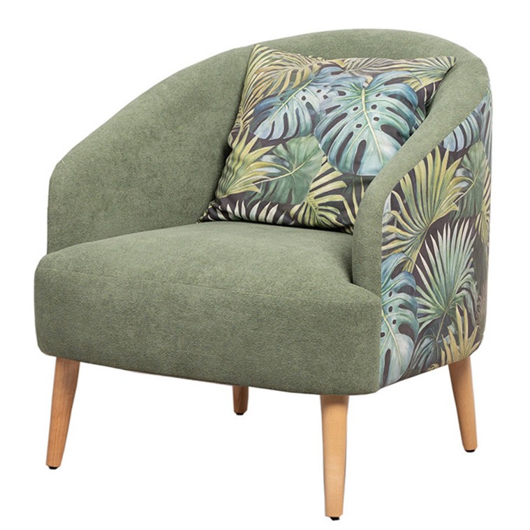 Кресло для отдыха на деревянных опорах. Спинка округлой формы переходящая в боковины. Кресло с подушкой думкой квадратной формы из ткани компаньон.