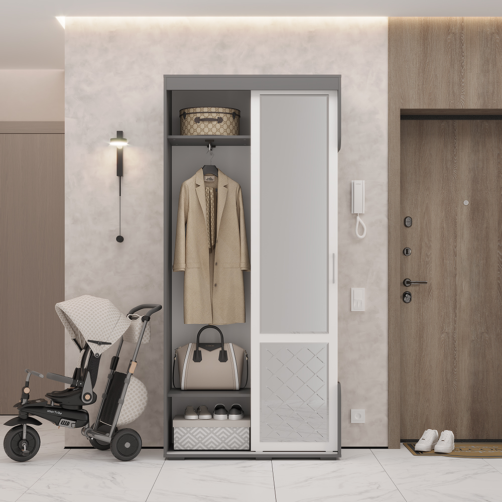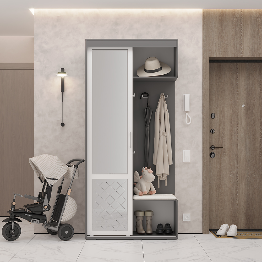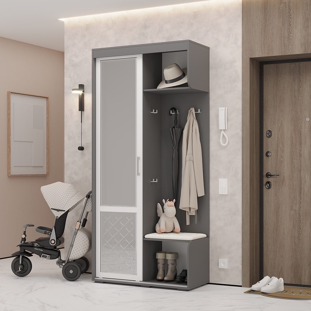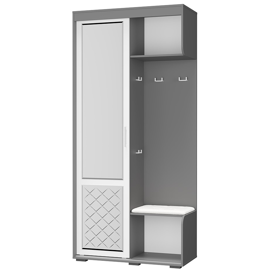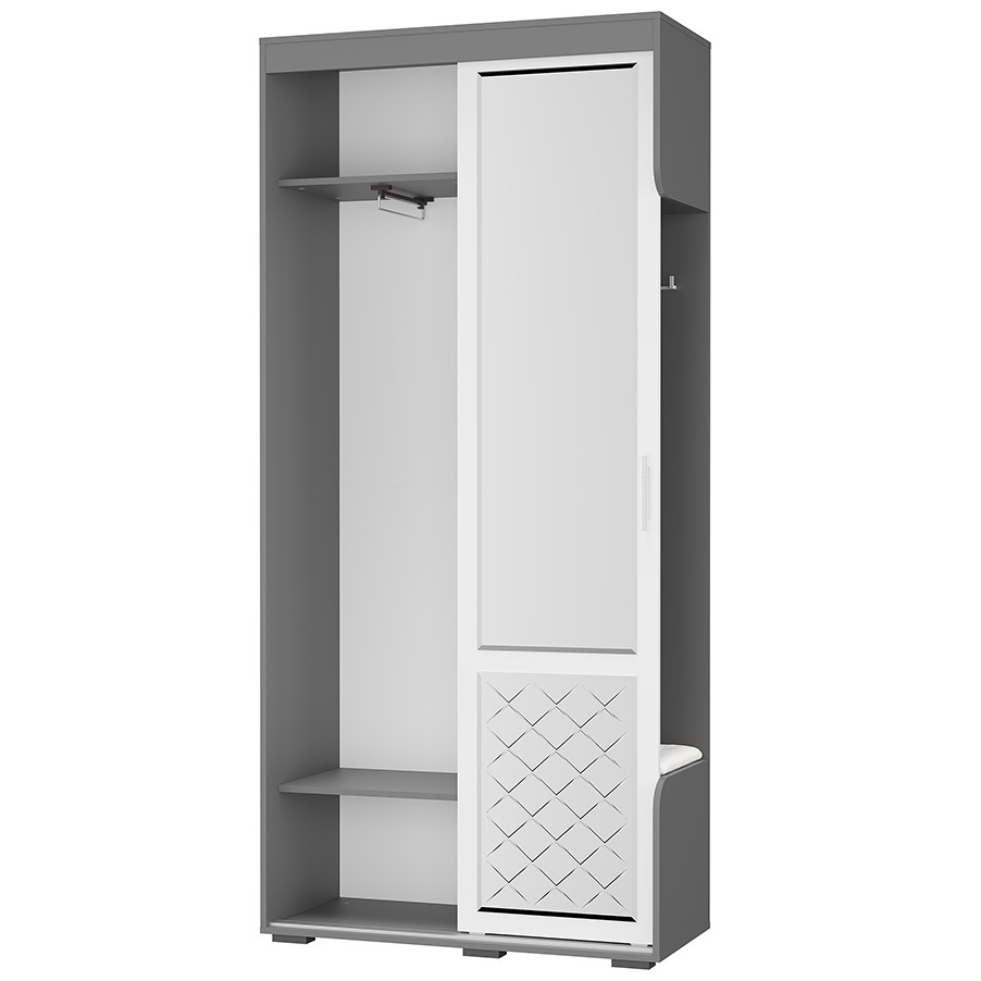 Кромка - ПВХ, 0,4 мм; ПВХ, 0,7 мм. Ручка - накладная пластик, 128 мм. Опоры - регулируемые, пластик, высота - 20 мм. Материал сидушки - белый кожзам. Максимальная нагрузка на полку - 10 кг, на штангу - 5 кг, на крючок - 3 кг, на сиденье - 70 кг.