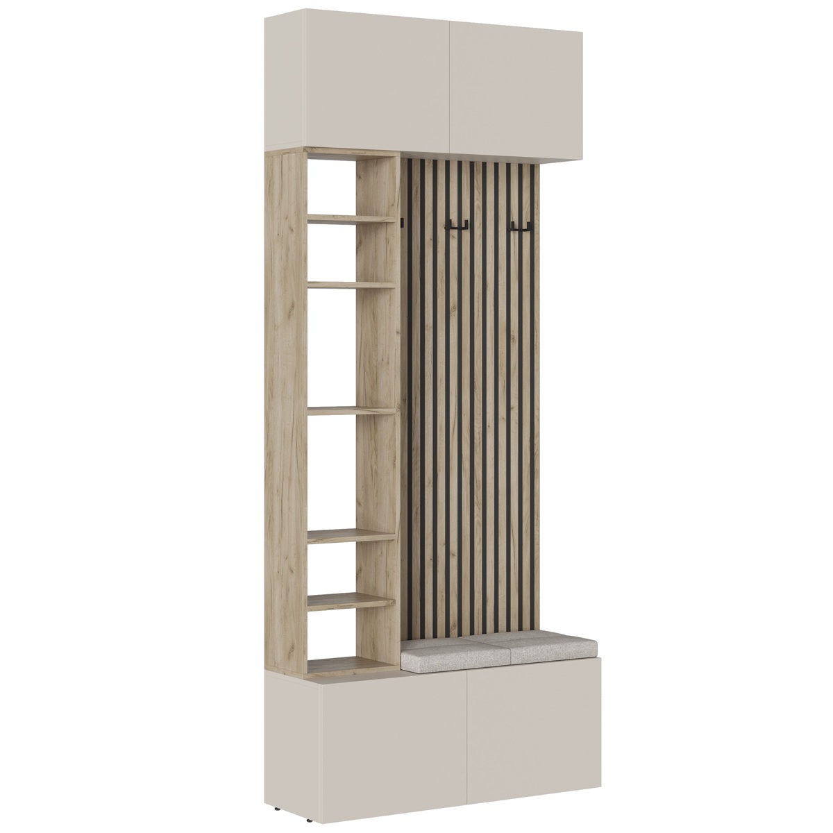 Нижняя часть: Тумба напольная. Сидушка — практичный элемент, позволяющий с комфортом надевать обувь.