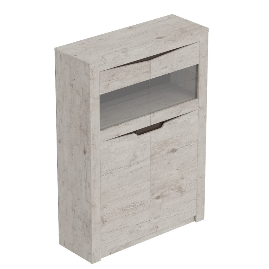 Внутри несъемная полка усиливает жесткость шкафа. Над стационарной полкой устанавливаются одна съемная стеклянная полка, из прозрачного стекла толщиной 5 мм, а в двух нижних отделениях устанавливаются четыре щитовые полки. Внутреннее пространство шкафа закрыто двумя составными дверями, имеющими по одной стеклянной вставке в верхней части.