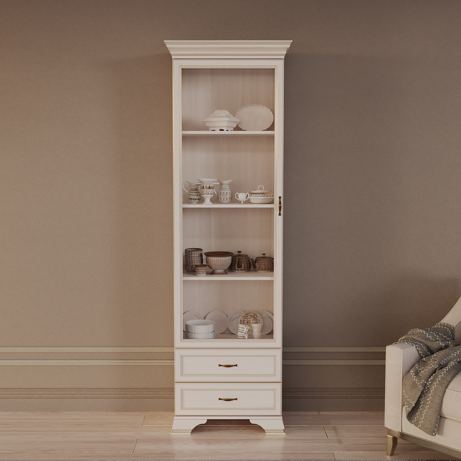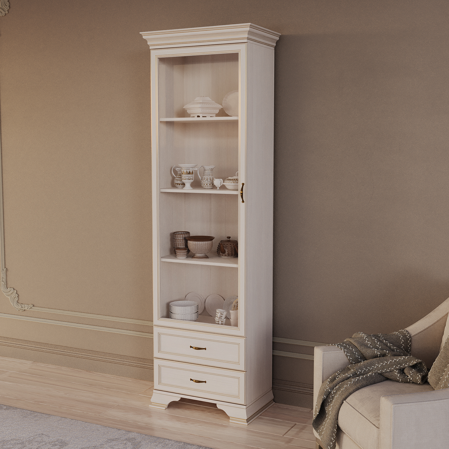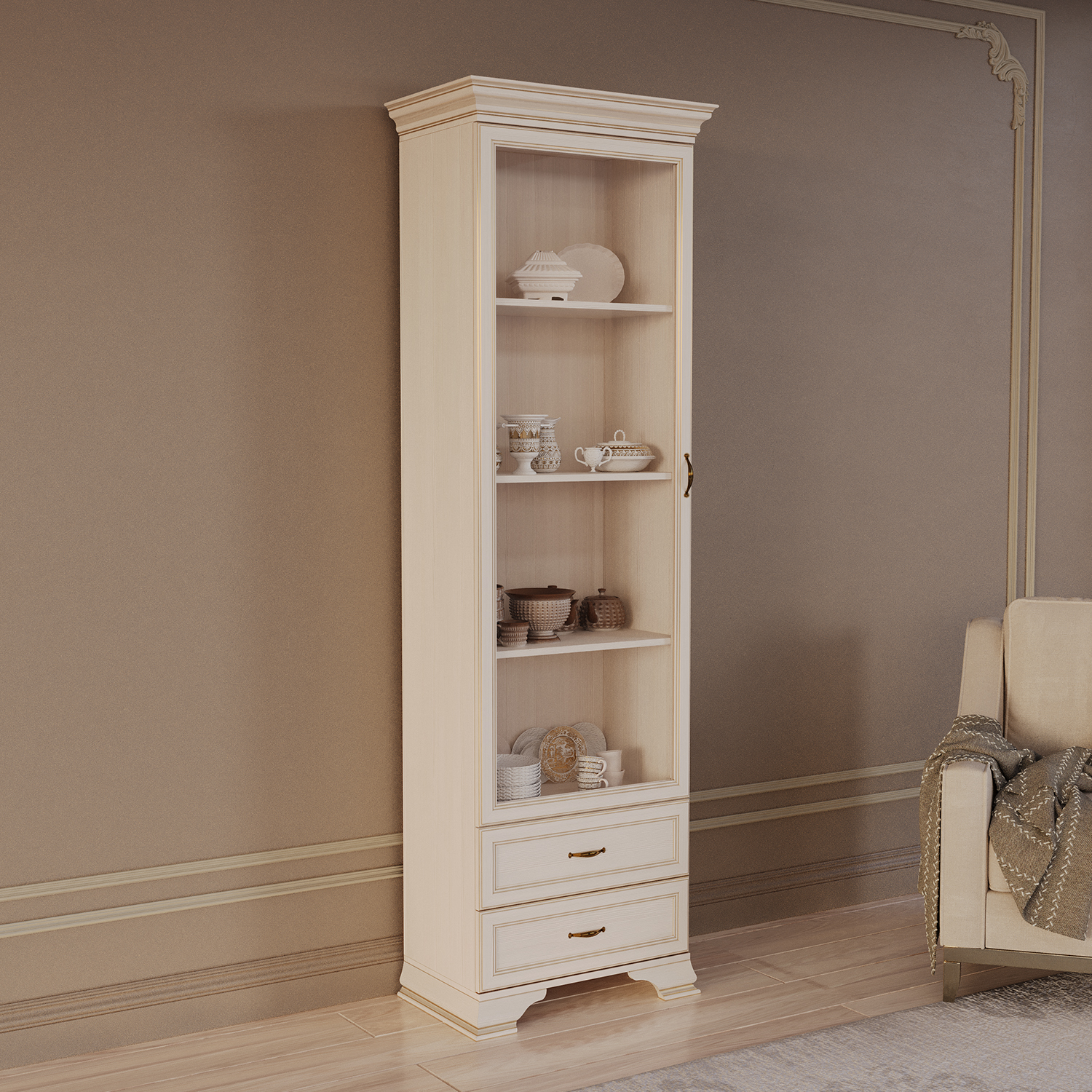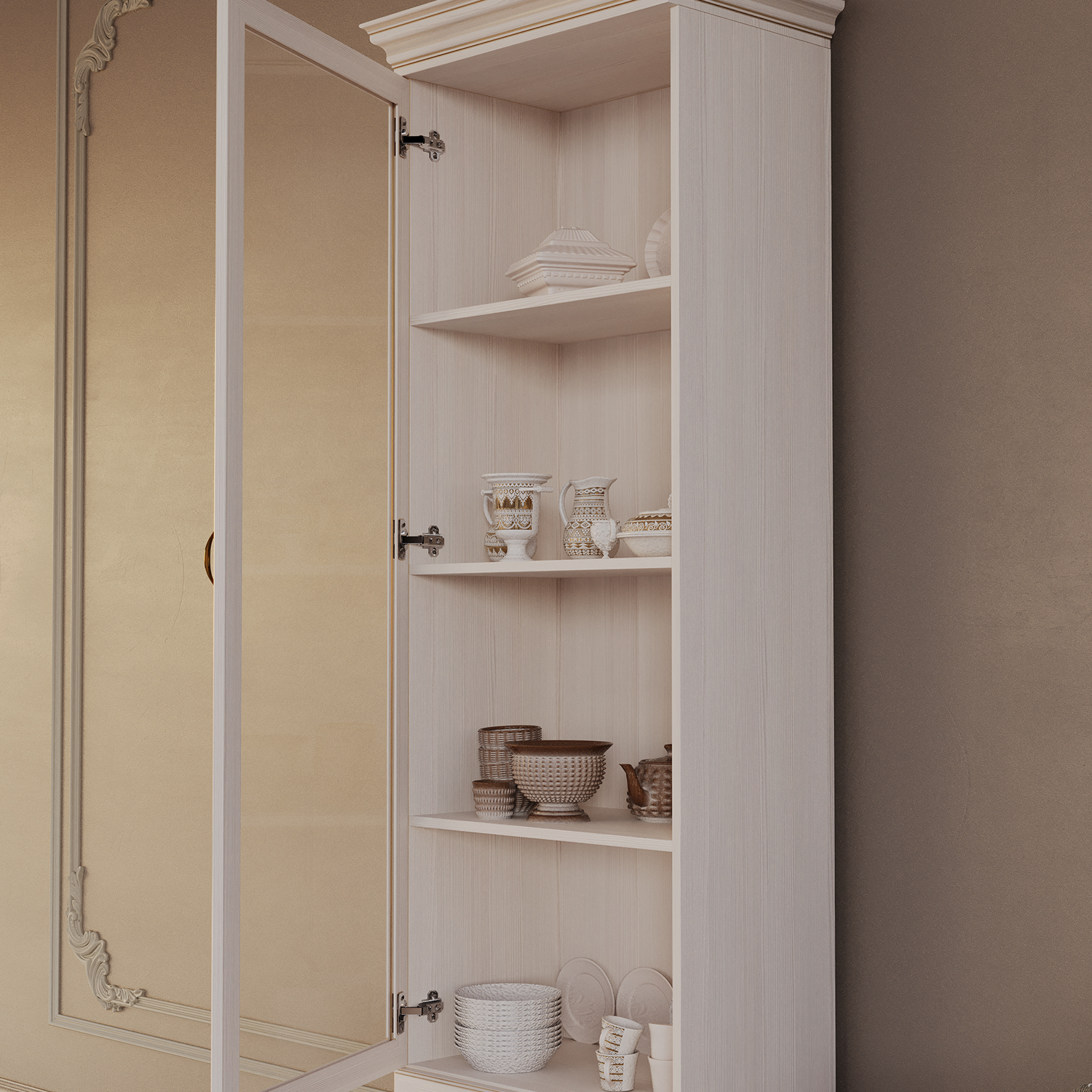 Благодаря прозрачному стеклу каждый сможет любоваться красивым наполнением витрины: сервизами, сувенирами или другими памятными мелочами. Такой модуль, безусловно, украсит интерьер современной гостиной в классическом стиле, обязательно оцените его достоинства:
