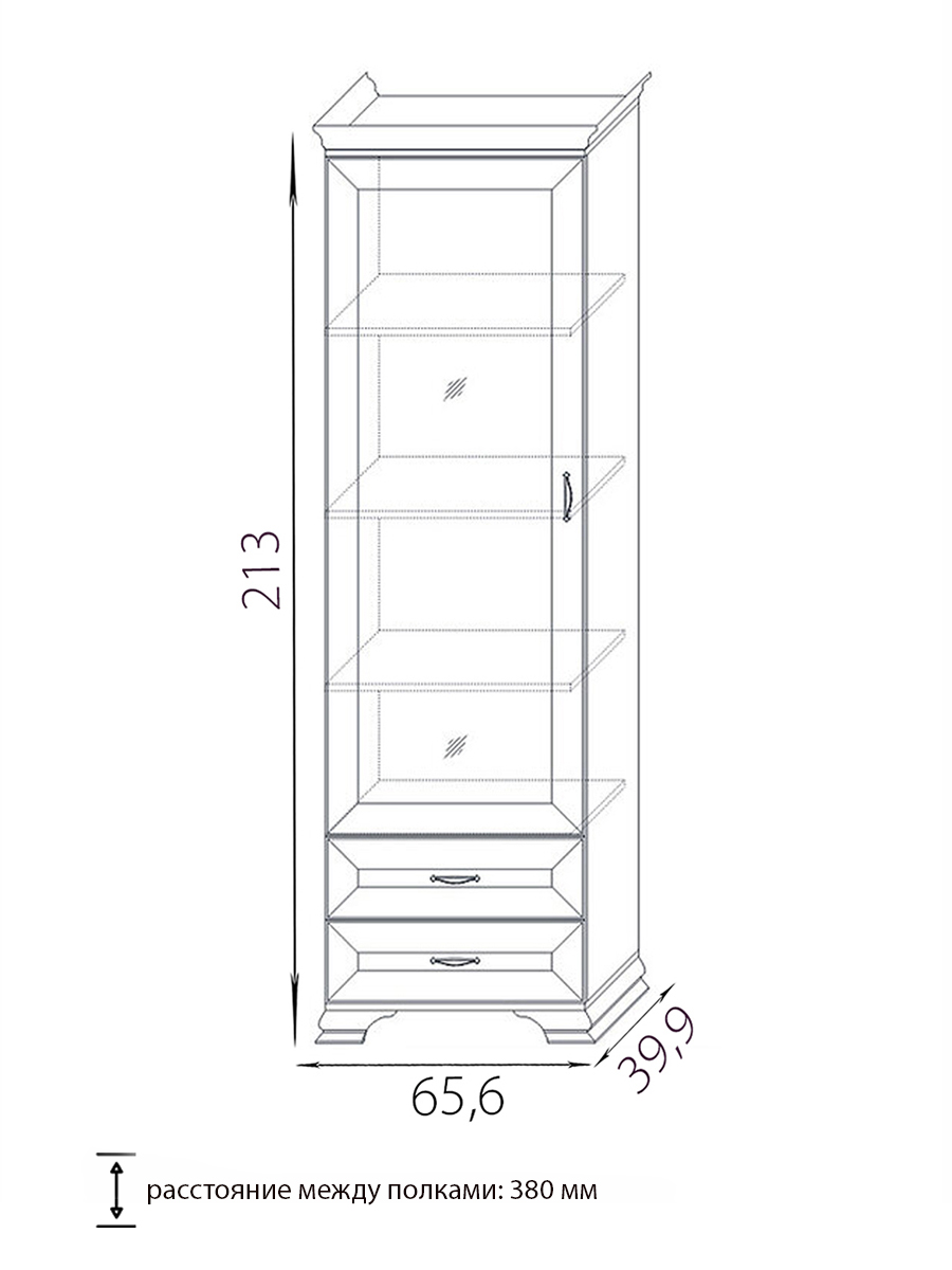 Внутреннее наполнение шкафа представлено 3 полками ЛДСП, однако вам доступна возможность приобрести 3 стеклополки. В нижней части изделия расположена 2 выдвижных ящика, где вы можете расположить различные вещи.